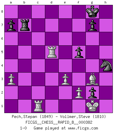 Last move : 1-0 2022 November 3 9:53:43 [Event "FICGS__CHESS__RAPID_B__000382"] [Site "FICGS"] [Date "2022.07.14"] [Round "1"] [White "Pech,Stepan"] [Black "Vollmer,Steve"] [Result "1-0"] [WhiteElo "1849"] [BlackElo "1810"] 1.b4 d5 2.Bb2 Nf6 3.Nf3 Bf5 4.e3 e6 5.a3 Nbd7 6.Be2 Bd6 7.Nh4 Bg6 8.Nxg6 hxg6 9.h3 Qe7 10.d3 Be5 11.c3 Nb6 12.Nd2 g5 13.Nf3 Nfd7 14.Nxe5 Nxe5 15.c4 Nbd7 16.cxd5 exd5 17.Rc1 c6 18.d4 Ng6 19.b5 Qe6 20.bxc6 bxc6 21.Qc2 Rb8 22.Bc3 f5 23.Bb4 c5 24.dxc5 O-O 25.c6 Rfc8 26.Bd3 Nh4 27.O-O Ne5 28.c7 Rb7 29.Ba5 Nxd3 30.Qxd3 g4 31.Rfd1 gxh3 32.Qxd5 Qxd5 33.Rxd5 R8xc7 34.Bxc7 hxg2 35.Bg3 1-0 Polish (Sokolsky) opening Kingside Castling by player Black (move 24) Kingside Castling by player White (move 27) Player White won this chess game. Follow this game move after move (download)Bobby Fischer is the greatest Chess player who has ever lived. (Ken Smith) Der Partner hat auch seine Existenzberechtigung. (Savielly Grigorievitsch Tartakower) Los finales de Peón son del Ajedrez lo que el cesped es del Golf. (Cecil Purdy) Ne tendez aucun piège pour le plaisir ! Ne jouez rien dans l'espoir que l'adversaire réagisse de façon stupide ! Prenez toujours pour acquis que l'adversaire va trouver le meilleur coup ! Ne jouez jamais de coup dans l'espoir que l'adversaire ne voie pas la menace ! Chacun de vos coups doit améliorer la position d'une façon ou d'une autre. There are two kinds of tragedy in this world, one is not getting what you want and the other is getting. (Lord of war)