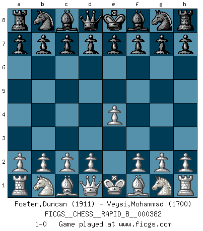 Last move : 1-0 2022 August 14 8:17:33 [Event "FICGS__CHESS__RAPID_B__000382"] [Site "FICGS"] [Date "2022.07.14"] [Round "1"] [White "Foster,Duncan"] [Black "Veysi,Mohammad"] [Result "1-0"] [WhiteElo "1911"] [BlackElo "1700"] 1.e4 1-0 This chess game has been lost on time (started : 2022.07.14 20:43:53) King's pawn Opening Player White won this chess game. Follow this game move after move (download)Chess is not like life... it has rules ! (Mark Pasternak) Weshalb minderdergeübte Spieler mit g2-g4 beginnen? Die betreffenden sind unschlüssig, ob sie nun rechts (h4) oder links (f4) beginnen sollen, und in ihrer Ratlosigkeit entschliessen sie sich nach guter Bürgerart dazu, den goldenen Mittelweg zu wählen. (Aaron Nimzowitsch) ¿Cual es el objetivo de jugar una apertura de gambito?... Para adquirir una reputación de ser un jugador apuesto a costo de perder el juego. (Siegbert Tarrasch) Le système Elo représente seulement une moyenne. Il est simplement un indicateur de votre stabilité. (Anatoli Karpov) The good fighters of old first put themselves beyond the possibility of defeat, and then waited for an opportunity of defeating the enemy. (Sun Tzu)