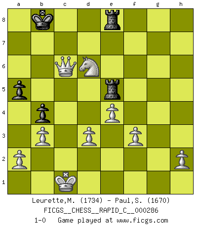 Last move : 1-0 2022 July 25 11:45:37 [Event "FICGS__CHESS__RAPID_C__000286"] [Site "FICGS"] [Date "2022.07.14"] [Round "1"] [White "Leurette,Marc-Antoine"] [Black "Paul,Samagata"] [Result "1-0"] [WhiteElo "1734"] [BlackElo "1670"] 1.e4 e5 2.Nf3 d6 3.Nc3 Nf6 4.Bc4 h6 5.d4 exd4 6.Nxd4 Be7 7.Qe2 O-O 8.Be3 c6 9.O-O-O b5 10.Bd3 Bb7 11.f3 Nbd7 12.g4 Ne5 13.Nf5 Re8 14.Nxe7+ Qxe7 15.g5 hxg5 16.Bxg5 Qe6 17.Qg2 Nxd3+ 18.cxd3 b4 19.Ne2 Nh7 20.b3 Nxg5 21.Qxg5 a5 22.Nd4 Qd7 23.Rhg1 g6 24.Qh6 Qe7 25.Rxg6+ fxg6 26.Rg1 g5 27.Rxg5+ Qxg5+ 28.Qxg5+ Kf7 29.Nf5 Re5 30.Nxd6+ Ke6 31.Qg6+ Kd7 32.Nxb7 Rae8 33.Qd6+ Kc8 34.Qxc6+ Kb8 35.Nd6 1-0 Philidor's defense Kingside Castling by player Black (move 7) Queenside Castling by player White (move 9) Player White won this chess game. Follow this game move after move (download)Openings teach you openings. Endgames teach you chess ! (Stephan Gerzadowicz) Schach ist die gewalttätigste aller Sportarten. (Garry Kasparov) El Ajedrez moderno está demasiado preocupado con cosas como la estructura de Peones. Olvidenlo, el Jaque Mate termina la partida. (Nigel Short) La victoire dans une partie d'Echecs appartient la plupart du temps à celui qui voit un peu plus loin que l'adversaire. (Lasker) Logic : The art of thinking and reasoning in strict accordance with the limitations and incapacities of the human misunderstanding. (Ambrose Bierce)