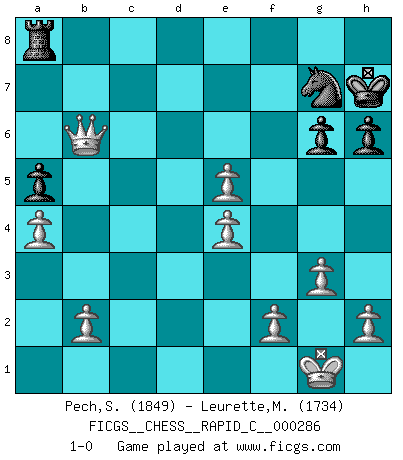 Last move : 1-0 2022 September 22 17:19:4 [Event "FICGS__CHESS__RAPID_C__000286"] [Site "FICGS"] [Date "2022.07.14"] [Round "1"] [White "Pech,Stepan"] [Black "Leurette,Marc-Antoine"] [Result "1-0"] [WhiteElo "1849"] [BlackElo "1734"] 1.d4 d5 2.c4 e6 3.Nc3 Nf6 4.Bg5 Be7 5.e3 b6 6.Nf3 Bb7 7.cxd5 exd5 8.Bd3 O-O 9.O-O Nbd7 10.Qc2 g6 11.Rfd1 Kg7 12.Rac1 c5 13.Be2 h6 14.Bf4 c4 15.Ne5 a6 16.a4 Nxe5 17.dxe5 Ne8 18.Nxd5 Bxd5 19.e4 Be6 20.Rxd8 Rxd8 21.Bxc4 a5 22.Bxe6 fxe6 23.Be3 Kh7 24.Bxb6 Ra8 25.Qd2 Bg5 26.Qd7+ Ng7 27.Rc7 Rg8 28.Qxe6 Bd8 29.Rb7 Ra6 30.Qd6 Bxb6 31.Rxb6 Rxb6 32.Qxb6 Ra8 33.g3 1-0 QGD : 4.Bg5 Be7 Kingside Castling by player Black (move 8) Kingside Castling by player White (move 9) Player White won this chess game. Follow this game move after move (download)The older I grow, the more I value Pawns. (Keres) Die Jungen erwarten, dass Opa einfach umfällt. Dann aber kann Opa fünf Stunden lang Schach spielen und die jungen Gegner an die Wand drücken. (Viktor Kortschnoi) Mis oponentes también hacen buenas movidas. A veces yo no tomo esas cosas en consideración. (Bobby Fischer) Le jeu d'échecs est comme rejeté hors du temps. (Antoine de Saint-Exupéry) For to win one hundred victories in one hundred battles is not the acme of skill. To subdue the enemy without fighting is the acme of skill. (Sun Tzu)
