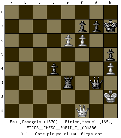 Last move : 0-1 2022 August 2 14:5:16 [Event "FICGS__CHESS__RAPID_C__000286"] [Site "FICGS"] [Date "2022.07.14"] [Round "1"] [White "Paul,Samagata"] [Black "Pintor,Manuel"] [Result "0-1"] [WhiteElo "1670"] [BlackElo "1694"] 1.e4 e5 2.c4 Bc5 3.d3 Qh4 4.g3 Qf6 5.Nf3 d6 6.Bg2 Bg4 7.O-O Nc6 8.Nbd2 Nd4 9.a3 a5 10.b3 Ne7 11.Bb2 Ne6 12.Qc2 O-O 13.h3 Bh5 14.Bc3 c6 15.b4 axb4 16.axb4 Bxf3 17.Nxf3 Bd4 18.Nxd4 Nxd4 19.Bxd4 exd4 20.f4 c5 21.bxc5 dxc5 22.e5 Qg6 23.Kh2 Nf5 24.Qf2 Ne3 25.Rxa8 Nxf1+ 26.Qxf1 Rxa8 27.Bxb7 Ra2+ 28.Bg2 h5 29.Qb1 Rd2 30.Qb8+ Kh7 31.Qb1 Rxd3 32.Qe1 Re3 33.Qf2 Qd3 34.h4 Qxc4 35.Kh3 Qe6+ 36.Kh2 c4 37.Bf1 c3 38.Qc2+ Qg6 39.Qf2 c2 40.f5 Qg4 41.e6 c1Q 42.f6 Qxf1 43.Qxf1 Qxg3+ 0-1 King's pawn game Kingside Castling by player White (move 7) Kingside Castling by player Black (move 12) Promotion Queen by player Black (move 41) Player Black won this chess game. Follow this game move after move (download)White lost because he failed to remember the right continuation and had to think up the moves himself. (Siegbert Tarrasch) Spiel ein langweiliges Spiel zu Ende und lustige Dinge können passieren. (Hans Ree) Coloca el contenido de las piezas del Ajedrez en un sombrero, agitalo vigorosamente, arrojalas en un tablero desde una altura de 30 centimetros y así obtendras el estilo de Steinitz. (H. E. Bird) Que feriez-vous si vous étiez en train de jouer aux échecs et que la fin du monde arrive ? Je continuerais à jouer. (Saint Borromée) A clear conscience is usually the sign of a bad memory. (Unknown)