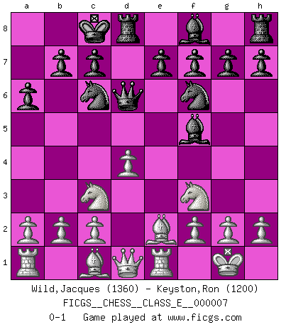 Last move : 0-1 2006 August 19 6:18:24 [Event "FICGS__CHESS__CLASS_E__000007"] [Site "FICGS"] [Date "2006.06.27"] [Round "1"] [White "Wild,Jacques"] [Black "Keyston,Ron"] [Result "0-1"] [WhiteElo "1360"] [BlackElo "1200"] 1.e4 d5 2.exd5 Qxd5 3.Nc3 Qd6 4.d4 Nf6 5.Nf3 a6 6.Be2 Nc6 7.O-O Bf5 8.Re1 O-O-O 0-1 This chess game has been lost on time (started : 2006.06.27 19:4:46) Scandinavian : Pytel-Wade variation Kingside Castling by player White (move 7) Queenside Castling by player Black (move 8) Player Black won this chess game. Follow this game move after move (download)For surely of all the drugs in the world, Chess must be the most permanently pleasurable. (Assiac) Schon mancher Spieler hat aufgegeben, um zu vermeiden, daß er eine Figur verliert. (Savielly Grigorievitsch Tartakower) En el Ajedrez, tal como en la vida, las bendiciones de hoy pueden ser el veneno del mañana. (Assaic) Mais n'est-ce pas déjà le limiter injurieusement que d'appeler les échecs un jeu? N'est-ce pas aussi une science, un art, ou quelque chose qui, comme le cercueil de Mahomet entre ciel et terre, est suspendu entre l'un et l'autre, et qui réunit un nombre incroyable de contraires ? (Stefan Zweig) Political correctness is subjecting us to gross incompetence. (Johann Piek)