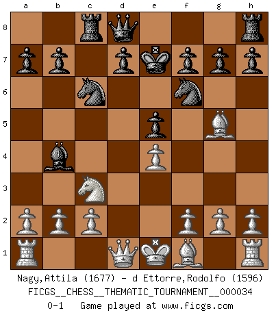 Last move : 0-1 2007 November 7 6:51:15 [Event "FICGS__CHESS__THEMATIC_TOURNAMENT__000034"] [Site "FICGS"] [Date "2007.08.02"] [Round "1"] [White "Nagy,Attila"] [Black "d Ettorre,Rodolfo"] [Result "0-1"] [WhiteElo "1677"] [BlackElo "1596"] 1.e4 c5 2.Nf3 e6 3.d4 cxd4 4.Nxd4 Bc5 5.Nc3 Nc6 6.Ndb5 Nf6 7.Nd6+ Ke7 8.Bf4 e5 9.Nxc8+ Rxc8 10.Bg5 Bb4 0-1 This chess game has been lost on time (started : 2007.08.02 17:51:17) Sicilian defense Player Black won this chess game. Follow this game move after move (download)I don't believe in psychology. I believe in good moves. (Bobby Fischer) Über die Verhaftung Bobby Fischers: Warum es die Bush-Administration für nötig befindet einen 61 Jahre alten Mann zu hetzten, der für niemanden ausser sich selbste eine Gefahr darstellt ist ein Rätsel. (Nigel Short) Cada Peón es una Reina en potencia. (James Mason) Les pièces de l'échiquier étaient impitoyables. Elles le retenaient, elles l'absorbaient. Il y avait de l'horreur en cela, mais aussi une harmonie unique. Car, qu'y a-t-il dans le monde, à part les échecs ? (V. Nabokov) Life is the sum of all your choices. (Albert Camus)