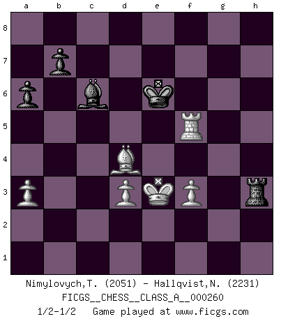 Last move : 1/2-1/2 2023 February 8 3:36:47 [Event "FICGS__CHESS__CLASS_A__000260"] [Site "FICGS"] [Date "2022.07.15"] [Round "1"] [White "Nimylovych,Taras"] [Black "Hallqvist,Niklas"] [Result "1/2-1/2"] [WhiteElo "2051"] [BlackElo "2231"] 1.e4 e6 2.d4 d5 3.Nc3 Bb4 4.e5 c5 5.a3 Bxc3+ 6.bxc3 Ne7 7.Qg4 cxd4 8.Bd3 Qc7 9.Ne2 dxc3 10.Qxg7 Rg8 11.Qxh7 Qxe5 12.Bf4 Qf6 13.h4 Nd7 14.Bg5 Qh8 15.Qxh8 Rxh8 16.Nxc3 a6 17.f3 f6 18.Bd2 Kf7 19.Kf2 e5 20.Rae1 Nc5 21.g4 Be6 22.h5 Rac8 23.g5 Nxd3+ 24.cxd3 fxg5 25.Rxe5 Nf5 26.R5e1 Ng7 27.h6 Nf5 28.h7 Rc7 29.Ne2 Kf8 30.Bxg5 Rcxh7 31.Rxh7 Rxh7 32.Bf4 d4 33.Be5 Kf7 34.Rc1 Bd7 35.Nxd4 Nxd4 36.Bxd4 Bc6 37.Rc5 Rh2+ 38.Ke3 Rh3 39.Rf5+ Ke6 1/2-1/2 French : Winawer, Advance, poisoned pawn variation This chess game ended in a draw. Follow this game move after move (download)Look at Garry Kasparov. After he loses, invariably he wins the next game. He just kills the next guy. That's something that we have to learn to be able to do. (Maurice Ashley) Wenn Du absolut nicht mehr weißt, was Du tun sollst, dann ist es Zeit für Panik. (John van der Wiel) ¿Porque tengo que perder ante este idiota?. (Aron Nimzovich) Des combinaisons [dans le jeu d'échecs] pareilles à des mélodies. Je crois entendre pour ainsi dire la musique des coups... (Vladimir Nabokov) The project of the man are lower than those of the sky. (Chinese proverb)