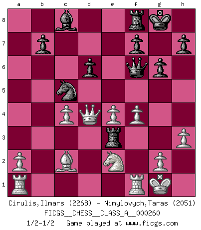 Last move : 1/2-1/2 2022 August 31 21:32:40 [Event "FICGS__CHESS__CLASS_A__000260"] [Site "FICGS"] [Date "2022.07.15"] [Round "1"] [White "Cirulis,Ilmars"] [Black "Nimylovych,Taras"] [Result "1/2-1/2"] [WhiteElo "2268"] [BlackElo "2051"] 1.c4 e5 2.Nc3 Nf6 3.Nf3 Nc6 4.e4 Bb4 5.d3 d6 6.h3 Bc5 7.Be2 O-O 8.O-O a5 9.Be3 Nd4 10.Qd2 c6 11.Bd1 Nd7 12.Bxd4 exd4 13.Ne2 Qf6 14.Nh2 Bb4 15.Qc2 g6 16.f4 a4 17.Nf3 a3 18.Nfxd4 axb2 19.Qxb2 c5 20.Qb3 Ra3 21.Qb1 cxd4 22.Qxb4 Rxd3 23.Bc2 Re3 24.Qd2 Nc5 25.Qxd4 1/2-1/2 English Opening Kingside Castling by player Black (move 7) Kingside Castling by player White (move 8) This chess game ended in a draw. Follow this game move after move (download)Chess teaches you to control the initial excitement you feel when you see something that looks good and it trains you to think objectively when you're in trouble. (Stanley Kubrick) Weshalb minderdergeübte Spieler mit g2-g4 beginnen? Die betreffenden sind unschlüssig, ob sie nun rechts (h4) oder links (f4) beginnen sollen, und in ihrer Ratlosigkeit entschliessen sie sich nach guter Bürgerart dazu, den goldenen Mittelweg zu wählen. (Aaron Nimzowitsch) Yo he agregado estos principios a la ley: pongan los Caballos en acción antes de que los dos Alfiles sean desarrollados. (Emanuel Lasker) L'action d'une oeuvre littéraire se déroule sur un champ de bataille. Les masques et les types du drame moderne correspondent aux pièces du jeu d'échecs. L'intrigue correspond aux coups et aux gambits, c'est à dire aux techniques du jeu telles qu'utilisées et interprétées par les joueurs. Les tactiques et les péripéties [mouvements] correspondent aux coups exécutés par l'adversaire. (Viktor Shklovsky) Sometimes it pays to stay in bed in Monday, rather than spending the rest of the week debugging Monday's code. (Dan Salomon)
