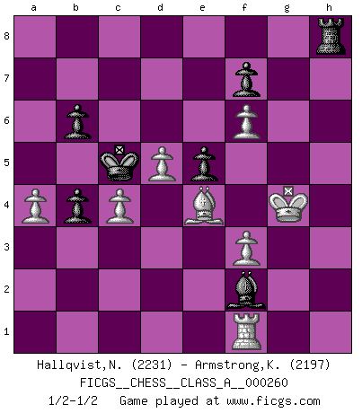 Last move : 1/2-1/2 2023 February 1 9:47:23 [Event "FICGS__CHESS__CLASS_A__000260"] [Site "FICGS"] [Date "2022.07.15"] [Round "1"] [White "Hallqvist,Niklas"] [Black "Armstrong,Keith"] [Result "1/2-1/2"] [WhiteElo "2231"] [BlackElo "2197"] 1.Nf3 Nf6 2.c4 e6 3.g3 d5 4.Bg2 Be7 5.O-O O-O 6.d4 dxc4 7.Qc2 a6 8.a4 Bd7 9.Qxc4 Bc6 10.Bf4 Bd6 11.Qc1 a5 12.Nc3 Na6 13.Bd2 Nb4 14.Qb1 Nbd5 15.Nh4 Nb4 16.e4 e5 17.d5 Bd7 18.Nf5 Bxf5 19.exf5 Bc5 20.Ne4 Bd4 21.Nxf6+ Qxf6 22.Be4 Rfd8 23.h4 Qb6 24.Bxb4 axb4 25.Qc2 Rd6 26.Qd2 Ra5 27.Kg2 h6 28.Qe2 Qa6 29.Qxa6 R5xa6 30.Rac1 Rd7 31.b3 Bc3 32.g4 Kf8 33.g5 Rd8 34.Kf3 Ke7 35.Rfd1 Rad6 36.Rh1 Rh8 37.Kg4 Rg8 38.Rcd1 Rh8 39.Rd3 Kd7 40.Rhd1 Kc8 41.Rf3 Rg8 42.Rh3 Kd7 43.Kf3 Rh8 44.R3h1 Ke7 45.Rhg1 Bd4 46.Rc1 Bc3 47.Rcd1 b6 48.Kg4 hxg5 49.hxg5 Rh2 50.Rg2 Rh8 51.Rg3 c5 52.Rh3 Rxh3 53.Kxh3 Rd7 54.Kg4 c4 55.bxc4 Kd6 56.f6 gxf6 57.gxf6 Rd8 58.f3 Rh8 59.Kg5 Bd4 60.Rb1 Be3+ 61.Kg4 Kc5 62.Re1 Bf2 63.Rf1 Bd4 64.Rb1 Bf2 65.Rf1 1/2-1/2 Reti Opening Kingside Castling by player White (move 5) Kingside Castling by player Black (move 5) This chess game ended in a draw. Follow this game move after move (download)I feel as if I were a piece in a game of Chess, when my opponent says of it: That piece cannot be moved. (Soren Kierkegaard) Schach ist das schnellste Spiel der Welt, weil man in jeder Sekunde Tausende von Gedanken ordnen muß. (Albert Einstein) a manera como él juega al Ajedrez, demuestra la completa naturaleza de un hombre. (Stanley Ellin) Assurément je connaissais par expérience le mystérieux attrait de ce jeu royal, le seul entre tous les jeux inventés par les hommes qui échappe souverainement à la tyrannie du hasard, le seul où l'on ne doive sa victoire qu'à son intelligence ou plutôt à une certaine forme d'intelligence. Mais n'est-ce pas déjà le limiter injurieusement que d'appeler les échecs un jeu ? N'est-ce pas une science, un art ou quelque chose qui, comme le cercueil de Mahomet entre ciel et terre, est suspendu entre l'un et l'autre, et qui réunit un nombre incroyable de contraires ? [...] C'est une pensée qui ne mène à rien, une mathématique qui n'établit rien, un art qui ne laisse pas d'uvre, une architecture sans matière; et il l'a prouvé néanmoins qu'il était plus durable, à sa manière, que les livres ou que tout autre monument, ce jeu unique qui appartient à tous les peuples et à tous les temps, et dont personne ne sait quel dieu en fit don à la terre pour tuer l'ennui, pour aiguiser l'esprit et stimuler l'âme. Où commence-t-il, où finit-il ? (Stefan Zweig) Perseverance does not equal worthiness. Next time you want to get my attention, wear something fun. Low-riding jeans are hot. (Gregory House, House M.D.)