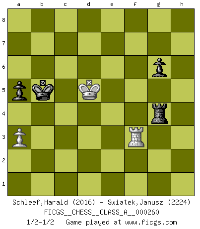 Last move : 1/2-1/2 2022 September 4 21:46:10 [Event "FICGS__CHESS__CLASS_A__000260"] [Site "FICGS"] [Date "2022.07.15"] [Round "1"] [White "Schleef,Harald"] [Black "Swiatek,Janusz"] [Result "1/2-1/2"] [WhiteElo "2016"] [BlackElo "2224"] 1.e4 c5 2.Nf3 d6 3.d4 Nf6 4.Nc3 cxd4 5.Nxd4 a6 6.f3 e5 7.Nb3 Be6 8.Be3 h5 9.Qd2 Nbd7 10.O-O-O Be7 11.Kb1 Rc8 12.Nd5 Bxd5 13.exd5 Nb6 14.Bxb6 Qxb6 15.Bd3 Rc7 16.c4 Nd7 17.Rde1 Kd8 18.Rhf1 h4 19.Re2 g6 20.g4 hxg3 21.hxg3 Kc8 22.g4 Bd8 23.Na5 Kb8 24.b4 Rc8 25.Nb3 Rh3 26.a3 Qa7 27.Ka2 Nb6 28.c5 Na4 29.Bc2 dxc5 30.Na5 cxb4 31.Nc6+ bxc6 32.Bxa4 cxd5 33.Rb1 Be7 34.Qxd5 Rc3 35.Qxe5+ Qc7 36.Qxc7+ Rxc7 37.Bc6 Rxc6 38.Rxe7 Rc2+ 39.Kb3 Rc7 40.Rbe1 Rxf3+ 41.Kxb4 Kb7 42.R1e3 Rxe3 43.Rxe3 Kb6 44.Rf3 a5+ 45.Kb3 Re7 46.Kc4 Re4+ 47.Kd5 Rxg4 48.Rxf7 Kb5 49.Rf3 1/2-1/2 Sicilian Queenside Castling by player White (move 10) 10 pieces endgame at move 42 : White KRPP , Black KRRPPP WHITE : King + 1 Rook 2 Pawns BLACK : King + 2 Rooks 3 Pawns 9 pieces endgame at move 43 : White KRPP , Black KRPPP WHITE : King + 1 Rook 2 Pawns BLACK : King + 1 Rook 3 Pawns 8 pieces endgame at move 47 : White KRP , Black KRPPP WHITE : King + 1 Rook 1 Pawn BLACK : King + 1 Rook 3 Pawns 7 pieces endgame at move 48 : White KRP , Black KRPP WHITE : King + 1 Rook 1 Pawn BLACK : King + 1 Rook 2 Pawns This chess game ended in a draw. Follow this game move after move (download)It is no time to be playing Chess when the house is on fire. (Italian Proverb) Die Partien sind immer verschieden, die Interviews immer die gleichen. (Garry Kasparov) Las combinaciones han sido siempre el aspecto más intrigante del Ajedrez. Los Maestros las buscan, el público las aplauden, los críticos las alaban. La razón se debe a que las combinaciones hacen posible que el Ajedrez sea más que un ejercicio matemático con una carencia de vida. Ellas son la poesía del juego, son del Ajedrez lo que la melodía es de la música. Ellas representan el triunfo de la mente sobre la materia. (Reuben Fine) Donnez-moi un Cavalier en 6e et je gagnerais toutes mes parties. (Steinitz) Any activity becomes creative when the doer cares about doing it right or doing it better. (John Updike)