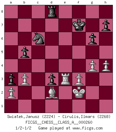 Last move : 1/2-1/2 2022 August 27 5:33:11 [Event "FICGS__CHESS__CLASS_A__000260"] [Site "FICGS"] [Date "2022.07.15"] [Round "1"] [White "Swiatek,Janusz"] [Black "Cirulis,Ilmars"] [Result "1/2-1/2"] [WhiteElo "2224"] [BlackElo "2268"] 1.d4 f5 2.g3 Nf6 3.Bg2 g6 4.Nf3 Bg7 5.c4 O-O 6.O-O d6 7.Nc3 Qe8 8.Re1 Qf7 9.Ng5 Qxc4 10.e4 fxe4 11.Ngxe4 Nxe4 12.Rxe4 Qf7 13.Rf4 Bf6 14.h4 c6 15.d5 Qg7 16.dxc6 Nxc6 17.Nd5 Rb8 18.Nxf6+ Rxf6 19.Rxf6 Qxf6 20.Bg5 Qf7 21.Qd2 Bg4 22.Re1 Bf3 23.Bxf3 Qxf3 24.Bxe7 d5 25.Bg5 d4 26.Re6 Qd5 27.Qe1 d3 28.Qe4 Qxe4 29.Rxe4 Rd8 30.Bd2 Nd4 31.Kg2 Kf7 32.Rf4+ Ke6 33.Re4+ Kf7 34.f3 a5 35.g4 a4 36.Kf2 b5 37.Re3 a3 38.b3 Nc6 1/2-1/2 Dutch defense Kingside Castling by player Black (move 5) Kingside Castling by player White (move 6) This chess game ended in a draw. Follow this game move after move (download)Fischer is the strongest player in the world. In fact, the strongest player who ever lived. (Larry Evans) Wenn sie aufgeben, dann danke ich Ihnen für das Spiel (Eventualzug beim Fernschach). (Anonymous) La pasion por jugar al Ajedrez es una de las mas inexplicables en el mundo. (H.G. Wells) Les échecs sont plus proches de l'art de l'assassinat que de l'art de la guerre. (Arturo Perez-Reverte) Whatever you do, don't be bored. This is absolutely the most exciting time we could have possibly hoped to be alive. And things are just starting. (From movie Waking life)