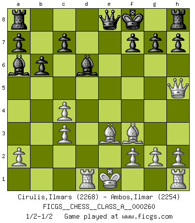 Last move : 1/2-1/2 2022 July 28 7:17:56 [Event "FICGS__CHESS__CLASS_A__000260"] [Site "FICGS"] [Date "2022.07.15"] [Round "1"] [White "Cirulis,Ilmars"] [Black "Ambos,Ilmar"] [Result "1/2-1/2"] [WhiteElo "2268"] [BlackElo "2254"] 1.c4 Nf6 2.Nc3 e5 3.Nf3 Nc6 4.e4 Bc5 5.Nxe5 Nxe5 6.d4 Bb4 7.dxe5 Nxe4 8.Qd4 Nxc3 9.bxc3 Be7 10.Qg4 Kf8 11.Be3 d6 12.Qe4 dxe5 13.Rd1 Qe8 14.Qxe5 b6 15.Be2 Bd6 16.Qh5 Ba6 17.Bf3 1/2-1/2 English Opening This chess game ended in a draw. Follow this game move after move (download)Bobby is the finest Chess player this country ever produced. His memory for the moves, his brilliance in dreaming up combinations, and his fierce determination to win are uncanny. (John Collins) Nur ein wirklich starker Spieler weiß wie schwach er spielt. (Savielly Grigorievitsch Tartakower) Hay dos clases de hombres: aquellos que se conforman en dejarse llevar por las circunstancias y que juegan barajas y aquellos decididos a controlar las circunstancias y que juegan al Ajedrez. (Mortimer Collins) Je ne suis pas le dernier à jouer lâchement des coups douteux pendant le zeïtnot de l'adversaire pour l'achever: en effet les coups qui font le plus peur sont ceux que l'on ne comprend pas. Je me fais souvent peur quand je joue. (Un professeur anonyme) Horse racing is animated roulette. (Roger Kahn)