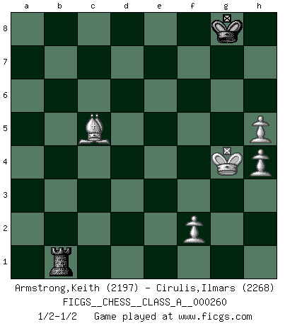 Last move : 1/2-1/2 2022 November 30 3:41:26 [Event "FICGS__CHESS__CLASS_A__000260"] [Site "FICGS"] [Date "2022.07.15"] [Round "1"] [White "Armstrong,Keith"] [Black "Cirulis,Ilmars"] [Result "1/2-1/2"] [WhiteElo "2197"] [BlackElo "2268"] 1.d4 f5 2.g3 Nf6 3.Bg2 g6 4.Nf3 Bg7 5.O-O O-O 6.c4 d6 7.Nc3 Qe8 8.Re1 Qf7 9.e4 fxe4 10.Nxe4 Nc6 11.Neg5 Qxc4 12.b3 Qb5 13.h3 Nb4 14.Rxe7 h6 15.Ne6 Bxe6 16.Rxe6 Qd7 17.Re1 Rfe8 18.Bd2 Rxe1+ 19.Bxe1 Nbd5 20.Qd3 Ne7 21.Bd2 c6 22.Bf1 Nfd5 23.Re1 Qf5 24.Kg2 Qxd3 25.Bxd3 Kf7 26.Bc4 Ke8 27.Nh4 Kf7 28.a4 a6 29.Nf3 Re8 30.Bb4 Rd8 31.Bd2 Rh8 32.g4 b5 33.Bd3 Nc7 34.h4 Ne6 35.Be3 Rc8 36.Rc1 Nd5 37.Kg3 Rc7 38.Bd2 Ne7 39.Rc2 Nd5 40.Be4 Ne7 41.Bd3 Nd5 42.Rc1 Ne7 43.Re1 Rb7 44.axb5 axb5 45.Be3 Rb8 46.Ra1 c5 47.Ra7 cxd4 48.Bc1 Nc5 49.Bxg6+ Kxg6 50.Rxe7 Nxb3 51.Bf4 d3 52.Rd7 Nc5 53.Rxd6+ Kf7 54.Nd2 b4 55.Kf3 Bc3 56.Nb1 h5 57.gxh5 Rf8 58.Rd5 d2 59.Nxd2 Kg8 60.Ke3 Bxd2+ 61.Rxd2 Re8+ 62.Kf3 b3 63.Be3 Rf8+ 64.Kg4 Rb8 65.Bxc5 b2 66.Rd1 b1Q 67.Rxb1 Rxb1 1/2-1/2 Dutch defense Kingside Castling by player White (move 5) Kingside Castling by player Black (move 5) 10 pieces endgame at move 61 : White KRBPPP , Black KRNP WHITE : King + 1 Rook 1 Bishop 3 Pawns BLACK : King + 1 Rook 1 Knight 1 Pawn 9 pieces endgame at move 65 : White KRBPPP , Black KRP WHITE : King + 1 Rook 1 Bishop 3 Pawns BLACK : King + 1 Rook 1 Pawn Promotion Queen by player Black (move 66) 8 pieces endgame at move 67 : White KRBPPP , Black KR WHITE : King + 1 Rook 1 Bishop 3 Pawns BLACK : King + 1 Rook 7 pieces endgame at move 67 : White KBPPP , Black KR WHITE : King + 1 Bishop 3 Pawns BLACK : King + 1 Rook This chess game ended in a draw. Follow this game move after move (download)In Chess, as it is played by masters, chance is practically eliminated. (Emanuel Lasker) Aljechin war kein Nazi. Er war ein Opportunist. Ein schrecklicher Mann. Er liebte Geld über alles und würde für Geld ein Jude, ein Katolik oder ein Protestant werden. (Miguel Najdorf) Preferería tener un Peón que un dedo. (Reuben Fine) Le succès, c'est être capable d'aller d'échec en échec sans perdre son enthousiasme. (Winston Churchill) Good decisions come from experience, and experience comes from bad decisions. (Anonymous)
