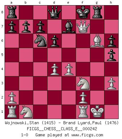 Last move : 1-0 2022 July 17 23:57:48 [Event "FICGS__CHESS__CLASS_E__000242"] [Site "FICGS"] [Date "2022.07.15"] [Round "1"] [White "Wojnowski,Stan"] [Black "Brand Lyard,Paul"] [Result "1-0"] [WhiteElo "1415"] [BlackElo "1476"] 1.e4 e5 2.Nf3 Nc6 3.Bc4 Bc5 4.b4 Bxb4 5.c3 Be7 6.O-O d6 7.d4 exd4 8.cxd4 Bg4 9.h3 Bxh3 10.gxh3 h5 11.Qb3 Nh6 12.Bxh6 gxh6 13.Bxf7+ Kf8 14.Bg6 Rg8 15.Qf7+ 1-0 Evans gambit : 5...Be7 Kingside Castling by player White (move 6) Player White won this chess game. Follow this game move after move (download)Chess is a forcing house where the fruits of character can ripen more fully than in life. (Edward Morgan Foster) Über Karpov: Er war und ist ein Vertreter der russischen Reaktionäre. Das steckt tief in seiner Seele, wehalb ich nicht nett mit ihm umgehen kann. (Viktor Kortschnoi) ¿Porque tengo que perder ante este idiota?. (Aron Nimzovich) Il n'y a pas de prix trop élevé au scalp de l'ennemi. (Koblentz) Art is the only way to run away without leaving home. (Twyla Tharp)