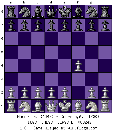 Last move : 1-0 2022 August 25 1:13:19 [Event "FICGS__CHESS__CLASS_E__000242"] [Site "FICGS"] [Date "2022.07.15"] [Round "1"] [White "Marcel,Alexis"] [Black "Correia,Alexsandro"] [Result "1-0"] [WhiteElo "1349"] [BlackElo "1200"] 1.f4 1-0 This chess game has been lost on time (started : 2022.07.15 14:39:1) Bird's Opening Player White won this chess game. Follow this game move after move (download)Up to this point White has been following well-known analysis. But now he makes a fatal error: he begins to use his own head. (Siegbert Tarrasch) Es gibt Leute, die glauben, alles wäre vernünftig, was man mit einem ernsthaften Gesicht tut. (Georg Christoph Lichtenberg) Cuando tengas duda... ¡juega al Ajedrez!. (Tevis) Les Cavaliers se révèlent fort utiles dans les positions fermées. D'habitude, les Fous sont un peu plus forts que les Cavaliers dans les positions ouvertes. Qu'on le veuille ou non, il restera toujours des exceptions ! For a mechanic, you seem to do an excessive amount of thinking. (C-3PO in Star Wars ep.2)