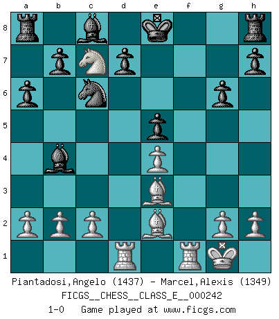 Last move : 1-0 2022 August 6 7:15:48 [Event "FICGS__CHESS__CLASS_E__000242"] [Site "FICGS"] [Date "2022.07.15"] [Round "1"] [White "Piantadosi,Angelo"] [Black "Marcel,Alexis"] [Result "1-0"] [WhiteElo "1437"] [BlackElo "1349"] 1.e4 g6 2.d4 Bg7 3.Nf3 c5 4.dxc5 Qa5+ 5.Bd2 Qxc5 6.Nc3 Nc6 7.Be2 a6 8.O-O Ne5 9.Nxe5 Bxe5 10.Be3 Qd6 11.Qxd6 Bxd6 12.Bd4 f6 13.f4 e5 14.Be3 Ne7 15.Rad1 Bb4 16.fxe5 fxe5 17.Nd5 Nc6 18.Nc7+ 1-0 Robatsch (Modern) defense Kingside Castling by player White (move 8) Player White won this chess game. Follow this game move after move (download)When you play Bobby, it is not a question if you win or lose. It is a question if you survive. (Boris Spassky) Es gibt zwei Arten von Opfern: Korrekte und meine. (Mikhail Nekhemyevich Tal) Hay dos clases de hombres: aquellos que se conforman en dejarse llevar por las circunstancias y que juegan barajas y aquellos decididos a controlar las circunstancias y que juegan al Ajedrez. (Mortimer Collins) Je ne crois pas en la psychologie, je crois aux bons coups. (Robert Fischer) What doesn't kill us makes us stronger. (Friedrich Nietzsche)