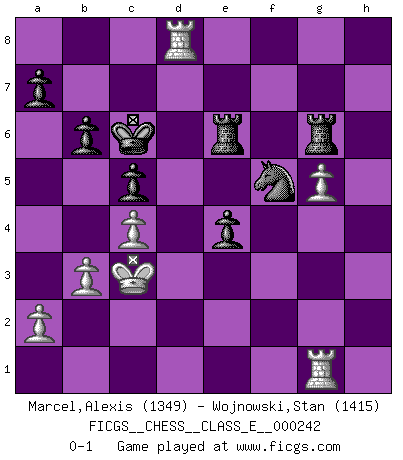 Last move : 0-1 2022 July 30 7:16:22 [Event "FICGS__CHESS__CLASS_E__000242"] [Site "FICGS"] [Date "2022.07.15"] [Round "1"] [White "Marcel,Alexis"] [Black "Wojnowski,Stan"] [Result "0-1"] [WhiteElo "1349"] [BlackElo "1415"] 1.f4 f5 2.e4 fxe4 3.d3 Nf6 4.Nc3 exd3 5.Bxd3 Nc6 6.g4 e6 7.g5 Ng8 8.Qh5+ g6 9.Bxg6+ Ke7 10.Be4 Bg7 11.Bd2 d5 12.Bg2 Nd4 13.O-O-O Bd7 14.Be3 Nb5 15.Bc5+ Nd6 16.Nb5 Bxb5 17.Nf3 b6 18.Bxd6+ Qxd6 19.Qg4 Rf8 20.Ne5 Bxe5 21.fxe5 Qxe5 22.Rhe1 Qf4+ 23.Qxf4 Rxf4 24.Rxd5 Bc6 25.Rd2 Bxg2 26.Rxg2 Rd4 27.Rge2 Rd6 28.h4 Kd7 29.Rf1 Ne7 30.b3 h6 31.Rg2 hxg5 32.hxg5 Nf5 33.Rfg1 Rg8 34.c4 Rg6 35.Kb2 e5 36.Re2 Rde6 37.Kc3 c5 38.Rd2+ Kc6 39.Rd8 e4 0-1 Bird's Opening Queenside Castling by player White (move 13) Player Black won this chess game. Follow this game move after move (download)Could we look into the head of a Chess player, we should see there a whole world of feelings, images, ideas, emotion and passion. (Alfred Binet) Matt entspricht nicht immer den Tatsachen. (Savielly Grigorievitsch Tartakower) No nos podemos resistir a la fascinación de un sacrificio ya que la pasión por los sacrificios es parte de la naturaleza de un jugador de Ajedrez. (Rudolf Spielman) Botvinnik disait en comparant les échecs à la musique: Il existe une science dont le but est l'étude de l'acoustique et des sons. Mais il y a aussi un art qui se sert de l'océan des sons : c'est la musique. De toute évidence, il en est de même pour la pensée. La logique est l'étude des lois de la réflexion et les échecs reflètent, en tant qu'art, le côté logique de la réflexion, sous la forme d'images artistiques... Extrait de Fischer - Spassky, Reykjavik 1972 par Alexander & F. Wyndham (Ed. Solar), p 37. A good aphorism is too hard for the tooth of time, and is not worn away with the centuries, although it serves as food for every speech. (Friedrich Nietzsche)