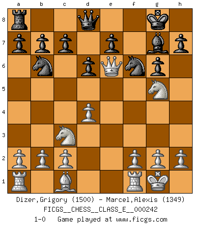 Last move : 1-0 2022 August 1 19:5:30 [Event "FICGS__CHESS__CLASS_E__000242"] [Site "FICGS"] [Date "2022.07.15"] [Round "1"] [White "Dizer,Grigory"] [Black "Marcel,Alexis"] [Result "1-0"] [WhiteElo "1500"] [BlackElo "1349"] 1.e4 g6 2.Nc3 Bg7 3.Bc4 d6 4.d4 Nd7 5.Nf3 Ngf6 6.O-O O-O 7.e5 Ne8 8.e6 Nb6 9.exf7+ Rxf7 10.Bxf7+ Kxf7 11.Qe2 Bg4 12.Ng5+ Kg8 13.Qxg4 Nf6 14.Qe6+ 1-0 Robatsch (Modern) defense Kingside Castling by player White (move 6) Kingside Castling by player Black (move 6) Player White won this chess game. Follow this game move after move (download)Chess is 99 percent tactics. (Teichmann) Dieses schreckliche Gefühl, dass ich gegen eine Maschine spielte, die niemals Fehler macht, zerschmetterte meinen Widerstand. (Mark Taimanov) El ganar no lo es todo... pero el perder es nada. (Mednis) On croit qu'il y a plus de mauvais joueurs que de bons joueurs, c'est faux : Il y a autant de joueurs qui gagnent que de joueurs qui perdent. (Philippe Geluck) Life is pain my dear and anyone who says otherwise is selling something. (Princess Bride)