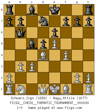 Last move : 1-0 2007 November 16 7:19:10 [Event "FICGS__CHESS__THEMATIC_TOURNAMENT__000034"] [Site "FICGS"] [Date "2007.08.02"] [Round "1"] [White "Schwarz,Ingo"] [Black "Nagy,Attila"] [Result "1-0"] [WhiteElo "1656"] [BlackElo "1677"] 1.e4 c5 2.Nf3 e6 3.d4 cxd4 4.Nxd4 Bc5 5.Be3 Qb6 6.b3 Nc6 7.c3 Nxd4 8.Bxd4 Nf6 9.f3 d5 10.e5 Nd7 11.f4 1-0 This chess game has been lost on time (started : 2007.08.02 17:51:17) Sicilian defense Player White won this chess game. Follow this game move after move (download)Chess, like love, like music, has the power to make people happy. (Siegbert Tarrasch) Man braucht nicht immer den besten Zug zu spielen: Ein Zug muß aktiv, unternehmungslustig, korrekt und schön sein. (David Bronstein) El Ajedrez, como la música, como el amor, tiene el poder de hacer feliz a la gente. (Siegbert Tarrasch) Les échecs, c'est la lutte contre l'erreur. (Johannes Zukertort) You cannot beat a roulette table unless you steal money from it. (Albert Einstein)