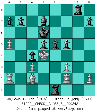 Last move : 0-1 2022 August 14 7:12:58 [Event "FICGS__CHESS__CLASS_E__000242"] [Site "FICGS"] [Date "2022.07.15"] [Round "1"] [White "Wojnowski,Stan"] [Black "Dizer,Grigory"] [Result "0-1"] [WhiteElo "1415"] [BlackElo "1500"] 1.d4 d5 2.Bf4 e6 3.Nf3 Nf6 4.e3 c5 5.Nbd2 Be7 6.Bd3 c4 7.Be2 O-O 8.Ne5 Nc6 9.g4 Nxe5 10.Bxe5 Bd6 11.Bg3 Qe7 12.Nf3 Nxg4 13.Ne5 Nh6 14.Bf4 Nf5 15.Bh5 f6 16.Ng4 Bxf4 17.exf4 Qb4+ 18.Qd2 Qxb2 19.O-O Qxd4 20.Qxd4 Nxd4 21.Ne3 g6 22.Bd1 Bd7 23.c3 Nf5 24.Nxf5 gxf5 25.f3 Kf7 26.a4 Rg8+ 27.Kf2 Rg7 28.Ke3 Ke7 29.Ra2 Rag8 30.R1f2 Rg1 31.Bc2 Re1+ 32.Kd4 Kd6 33.a5 e5+ 34.fxe5+ fxe5+ 0-1 Queen's pawn, Mason variation Kingside Castling by player Black (move 7) Kingside Castling by player White (move 19) Player Black won this chess game. Follow this game move after move (download)I prefer to lose a really good game than to win a bad one. (David Levy) Alle Schachspieler sollten auch ein Hobby haben. (Savielly Grigorievitsch Tartakower) Las combinaciones han sido siempre el aspecto más intrigante del Ajedrez. Los Maestros las buscan, el público las aplauden, los críticos las alaban. La razón se debe a que las combinaciones hacen posible que el Ajedrez sea más que un ejercicio matemático con una carencia de vida. Ellas son la poesía del juego, son del Ajedrez lo que la melodía es de la música. Ellas representan el triunfo de la mente sobre la materia. (Reuben Fine) Si je n'étais pas joueur d'échecs, je serais le meilleur dans quelque chose d'autre. (Anatoli Karpov) You must do what you feel is right... of course. (Obi-Wan Kenobi in Star Wars ep.4)