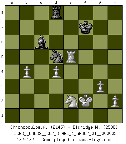 Last move : 1/2-1/2 2022 August 22 11:57:57 [Event "FICGS__CHESS__CUP_STAGE_1_GROUP_01__000005"] [Site "FICGS"] [Date "2022.07.16"] [Round "1"] [White "Chronopoulos,Antonis"] [Black "Eldridge,Mark"] [Result "1/2-1/2"] [WhiteElo "2145"] [BlackElo "2508"] 1.d4 Nf6 2.c4 e6 3.Nf3 d5 4.Nc3 c6 5.e3 Nbd7 6.Qc2 Bd6 7.Bd3 O-O 8.O-O dxc4 9.Bxc4 b5 10.Bd3 Bb7 11.a3 Rc8 12.Ng5 c5 13.Bxh7+ Kh8 14.f4 g6 15.Bxg6 fxg6 16.Nxb5 Bb8 17.Nxe6 Qb6 18.Nxf8 Nxf8 19.Nc3 cxd4 20.exd4 Ne6 21.Be3 Nd5 22.Qxg6 Nxe3 23.Rae1 Bxf4 24.Qf6+ Kg8 25.Rxf4 Nxf4 26.Qg5+ Qg6 27.Qxg6+ Nxg6 28.Rxe3 Rd8 29.Ne2 a5 30.g3 Kf7 31.b4 axb4 32.axb4 Ne7 33.Re5 Nd5 34.Kf2 Bc6 1/2-1/2 Queen's pawn game Kingside Castling by player Black (move 7) Kingside Castling by player White (move 8) This chess game ended in a draw. Follow this game move after move (download)Chess is a fairy tale of 1001 blunders. (Savielly Tartakower) Wenn Du einsam bist, wenn Du Dich in der Welt wie ein Fremder fühlst, spiele Schach. Das wird Deinen Geist erheben und Dein Ratgeber im Kampf sein. (Aristoteles) Siempre es mucho mejor sacrificar las piezas de tu oponente. (Savielly Tartakover) La conception d'un plan est le processus par lequel un joueur exploite les avantages de sa position tout en s'efforçant d'en réduire au minimum les inconvénients. Afin de garantir le succès, un plan doit toujours se fonder sur un diagnostic objectif des particularités d'une position. La conception d'un plan est d'autant plus difficile que la position est équilibrée, et grandement facilitée lorsqu'il n'existe qu'un seul plan susceptible de répondre aux exigences de la position. (Harry Golombek) There are two major products that came out of Berkeley: LSD and UNIX. We do not believe this is to be a coincidence. (Jeremy S. Anderson)