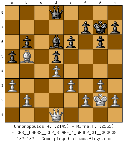 Last move : 1/2-1/2 2022 July 24 19:55:31 [Event "FICGS__CHESS__CUP_STAGE_1_GROUP_01__000005"] [Site "FICGS"] [Date "2022.07.16"] [Round "1"] [White "Chronopoulos,Antonis"] [Black "Mirra,Theodore"] [Result "1/2-1/2"] [WhiteElo "2145"] [BlackElo "2262"] 1.d4 Nf6 2.c4 e6 3.g3 d5 4.Nf3 Bb4+ 5.Bd2 Be7 6.Bg2 O-O 7.Qc2 c6 8.O-O b6 9.Ne5 Bb7 10.cxd5 cxd5 11.Rc1 Ne4 12.a3 Nd6 13.Qd1 Qe8 14.Bb4 Nc6 15.Nxc6 Bxc6 16.Nc3 Qd7 17.Rc2 a5 18.Bxd6 Bxd6 19.Rac1 Rac8 20.Qd2 Rc7 21.Bf1 Rfc8 22.e3 Ba4 23.Nxa4 Qxa4 24.Rxc7 Rxc7 25.Rxc7 Bxc7 26.Qc3 Bd6 27.Be2 Qd7 28.Qb3 Qc7 29.Kg2 g6 30.Bb5 Kg7 31.Qd1 Qb8 32.Kf1 Qd8 33.Kg2 1/2-1/2 Catalan Opening Kingside Castling by player Black (move 6) Kingside Castling by player White (move 8) This chess game ended in a draw. Follow this game move after move (download)A sacrifice is best refuted by accepting it. (Wilhelm Steinitz) Kasparov stellt für gewöhnlich die Regeln auf und bricht sie dann selbst wieder. (Alexej Shirov) El Ajedrez es en su esencia, un juego. En su forma, un arte. Y en su ejecución, una ciencia. (Baron Tassilo) Botvinnik disait en comparant les échecs à la musique: Il existe une science dont le but est l'étude de l'acoustique et des sons. Mais il y a aussi un art qui se sert de l'océan des sons : c'est la musique. De toute évidence, il en est de même pour la pensée. La logique est l'étude des lois de la réflexion et les échecs reflètent, en tant qu'art, le côté logique de la réflexion, sous la forme d'images artistiques... Extrait de Fischer - Spassky, Reykjavik 1972 par Alexander & F. Wyndham (Ed. Solar), p 37. Programmer - an organism that turns coffee into software. (Anonymous)