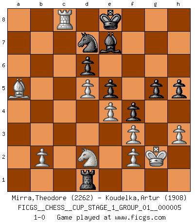 Last move : 1-0 2022 October 2 7:24:41 [Event "FICGS__CHESS__CUP_STAGE_1_GROUP_01__000005"] [Site "FICGS"] [Date "2022.07.16"] [Round "1"] [White "Mirra,Theodore"] [Black "Koudelka,Artur"] [Result "1-0"] [WhiteElo "2262"] [BlackElo "1908"] 1.e4 c5 2.Nf3 Nc6 3.Bb5 d6 4.O-O Bd7 5.Re1 Nf6 6.c3 a6 7.Bf1 Bg4 8.d4 cxd4 9.cxd4 e5 10.d5 Nd4 11.Be3 Nxf3+ 12.gxf3 Bd7 13.Nd2 b5 14.a4 Be7 15.axb5 axb5 16.Rxa8 Qxa8 17.Qa1 O-O 18.Rc1 Qb7 19.Qa7 Qxa7 20.Bxa7 Ne8 21.Be3 f5 22.Ra1 Nf6 23.Ra7 f4 24.Bb6 g5 25.Ba5 Rb8 26.Bc7 Rc8 27.Rb7 h5 28.h3 Be8 29.Ba5 Kf8 30.Bxb5 Bxb5 31.Rxb5 Nd7 32.Rb7 Rc1+ 33.Kg2 Ke8 34.Rc7 Rd1 35.Rc8+ 1-0 Sicilian : Nimzovich-Rossolimo attack (without ...d6) Kingside Castling by player White (move 4) Kingside Castling by player Black (move 17) Player White won this chess game. Follow this game move after move (download)No price is too great for the scalp of the enemy King. (Koblentz) Zu meiner Zeit war ein 20 jähriger ein junger Spieler, heute ist er ein Veteran. (Garry Kasparov) Solo puedes ser bueno en el Ajedrez si amas al juego. (Bobby Fischer) La vérité est comme le meilleur coup aux échecs : elle existe, mais il faut la chercher. (Arturo Perez-Reverte) For to win one hundred victories in one hundred battles is not the acme of skill. To subdue the enemy without fighting is the acme of skill. (Sun Tzu)