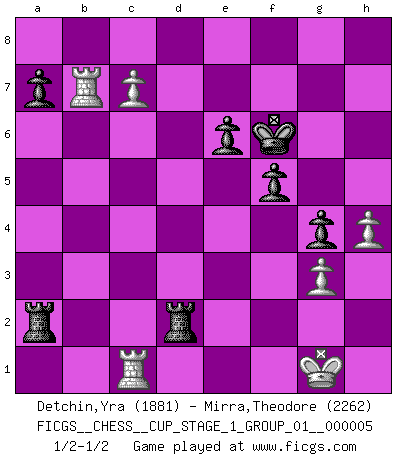 Last move : 1/2-1/2 2022 August 21 22:34:44 [Event "FICGS__CHESS__CUP_STAGE_1_GROUP_01__000005"] [Site "FICGS"] [Date "2022.07.16"] [Round "1"] [White "Detchin,Yra"] [Black "Mirra,Theodore"] [Result "1/2-1/2"] [WhiteElo "1881"] [BlackElo "2262"] 1.d4 Nf6 2.c4 e6 3.Nf3 d5 4.Nc3 c6 5.Bg5 h6 6.Bh4 dxc4 7.e4 g5 8.Bg3 b5 9.h4 g4 10.Ne5 Nbd7 11.Be2 Bb7 12.Nxd7 Qxd7 13.Be5 Qe7 14.O-O Rg8 15.b3 Bg7 16.Qc2 Nh5 17.Bxg7 Rxg7 18.g3 Qd6 19.e5 Qxd4 20.Rad1 Qxe5 21.Ne4 Kf8 22.Rfe1 c5 23.Bxc4 bxc4 24.Nd6 Qf6 25.Nxb7 Qf3 26.Qd2 Nxg3 27.fxg3 Qxb7 28.Qxh6 Kg8 29.bxc4 Qf3 30.Qe3 Qxe3+ 31.Rxe3 Re8 32.Re5 f5 33.Rxc5 Rb7 34.Rc6 Kf7 35.c5 Rb2 36.Rc1 Rxa2 37.Rc7+ Kf6 38.Rb7 Ra3 39.Kg2 Ra2+ 40.Kg1 Ra3 41.Kg2 Ra2+ 42.Kg1 Rd8 43.c6 R8d2 44.c7 1/2-1/2 Queen's pawn game Kingside Castling by player White (move 14) This chess game ended in a draw. Follow this game move after move (download)Chess teaches you to control the initial excitement you feel when you see something that looks good and it trains you to think objectively when you're in trouble. (Stanley Kubrick) Wie, soll nun auch die Opposition abgeschafft werden? Ja, es tut mir leid, Ihnen diesen Schmerz nicht ersparen zu können. (Aaron Nimzowitsch) Cuando tu casa esta en llamas, no puedes ser molestado por tus vecinos. O, como decinos en Ajedrez, si tu Rey esta bajo ataque, no te preocupa perder un Peón del lado de la Reina. (Gary Kasparov) A chaque perte on perd un peu de soi. (Joël Lautier) If you have any trouble condescending, find a Unix user to show you how it's done. (Scott Adams)