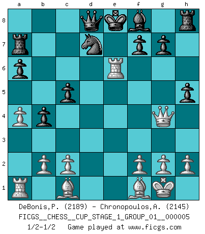Last move : 1/2-1/2 2022 August 13 8:56:34 [Event "FICGS__CHESS__CUP_STAGE_1_GROUP_01__000005"] [Site "FICGS"] [Date "2022.07.16"] [Round "1"] [White "DeBonis,Patrick"] [Black "Chronopoulos,Antonis"] [Result "1/2-1/2"] [WhiteElo "2189"] [BlackElo "2145"] 1.e4 c5 2.Nf3 d6 3.Bb5+ Nd7 4.O-O a6 5.Bd3 Ngf6 6.Re1 e6 7.Bf1 b5 8.a4 Bb7 9.d4 Bxe4 10.dxc5 dxc5 11.Nc3 Bxf3 12.Qxf3 b4 13.Ne4 Nxe4 14.Qxe4 Ra7 15.Qg4 h5 16.Rxe6+ 1/2-1/2 Sicilian : Canal-Sokolsky (Nimzovich-Rossolimo, Moscow) attack Kingside Castling by player White (move 4) This chess game ended in a draw. Follow this game move after move (download)Chess is war over the board. The object is to crush the opponents mind. (Bobby Fischer) Die Idee von Capablanca, Schach als Fach in den Schulen zu lehren, ist großartig. (Fidel Castro) Aquel que toma al Peón de Caballo de la Reina, se pasará la noche a dormir en la calle. (Anónimo) Je crois qu'il existe des manières très spécifiques de jouer efficacement contre une machine. Evidemment, nous n'avons aucune chance en technique pure, parce que l'ordinateur calcule de manière parfaite. Mais lorsque nous faisons appel à notre cerveau, en utilisant l'intuition et la compréhension, alors nous restons beaucoup plus forts. (Anatoli Karpov) Statistics can be made to prove anything - even the truth. (Author unknown)