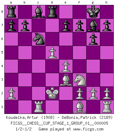 Last move : 1/2-1/2 2022 September 26 17:20:42 [Event "FICGS__CHESS__CUP_STAGE_1_GROUP_01__000005"] [Site "FICGS"] [Date "2022.07.16"] [Round "1"] [White "Koudelka,Artur"] [Black "DeBonis,Patrick"] [Result "1/2-1/2"] [WhiteElo "1908"] [BlackElo "2189"] 1.d4 Nf6 2.c4 g6 3.Nc3 d5 4.cxd5 Nxd5 5.e4 Nxc3 6.bxc3 Bg7 7.Nf3 c5 8.Be3 Qa5 9.Qd2 Nc6 10.Rc1 cxd4 11.cxd4 Qxd2+ 12.Kxd2 O-O 13.d5 Rd8 1/2-1/2 King's Indian defense, 3.Nc3 Kingside Castling by player Black (move 12) This chess game ended in a draw. Follow this game move after move (download)We must make sure that Chess will not be like a dead language, very interesting, but for a very small group. (Sytze Faber) Ivan Sokolov treibt mich als Beifahrer an mit go Loeky go - . (Loek van Wely) Los problemas de Ajedrez exigen del compositor las mismas virtudes que caracterizan todo el arte de valor: originalidad, invención, concisión, armonía, complejidad e insinceridad explendida. (Vladimir Nabokov) Les Echecs mettent en conflit, non pas deux intelligences, mais deux volontés. (Lasker) As a goal marker shodan is important. As a destination it is a poor place to stop. (Thomas Tamayo)