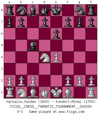 Last move : 0-1 2007 September 11 19:54:53 [Event "FICGS__CHESS__THEMATIC_TOURNAMENT__000034"] [Site "FICGS"] [Date "2007.08.02"] [Round "1"] [White "Varkalis,Valdas"] [Black "Kondort,Mihai"] [Result "0-1"] [WhiteElo "1600"] [BlackElo "1700"] 1.e4 c5 2.Nf3 e6 3.d4 cxd4 4.Nxd4 Bc5 0-1 This chess game has been lost on time (started : 2007.08.02 17:51:17) Sicilian defense Player Black won this chess game. Follow this game move after move (download)Chess is above all, a fight ! (Emanuel Lasker) Ein Kibitz ist einer, der deinem Gegner gute Ratschläge gibt. (Andrew Soltis) El Ajedrez era la lengua materna de Capablanca. (Reti) Le génie consiste à savoir transgresser les règles au moment opportun. (Teichmann) History is a gallery of pictures in which there are few originals and many copies. (Alexis de Tocqueville)