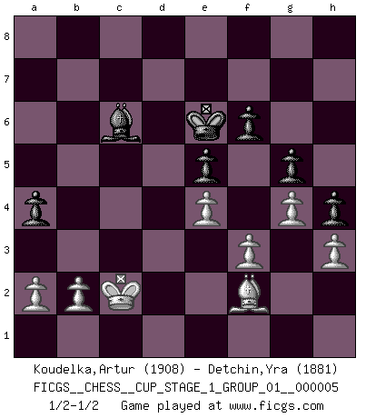 Last move : 1/2-1/2 2022 October 4 2:30:11 [Event "FICGS__CHESS__CUP_STAGE_1_GROUP_01__000005"] [Site "FICGS"] [Date "2022.07.16"] [Round "1"] [White "Koudelka,Artur"] [Black "Detchin,Yra"] [Result "1/2-1/2"] [WhiteElo "1908"] [BlackElo "1881"] 1.c4 e5 2.Nc3 Bb4 3.Nd5 Be7 4.d4 exd4 5.Qxd4 Nf6 6.Nxe7 Qxe7 7.Bg5 Nc6 8.Qc3 Ne5 9.Nf3 d6 10.Nxe5 dxe5 11.e3 a5 12.O-O-O O-O 13.f3 h6 14.Bh4 Qc5 15.Rd2 Be6 16.Bd3 a4 17.Rhd1 Nd7 18.e4 Qc6 19.Be2 f6 20.Kb1 b6 21.Bf2 Nc5 22.Qb4 Ra5 23.g4 Bf7 24.h3 Ne6 25.Be3 R5a8 26.Qb5 Qe8 27.Rc1 h5 28.Qxe8 Rfxe8 29.c5 bxc5 30.Bxc5 Red8 31.Rxd8+ Rxd8 32.Be3 Kf8 33.Bc4 h4 34.Bd5 Rd6 35.Rc3 Be8 36.Kc2 Ke7 37.Bxe6 Kxe6 38.Rxc7 Rc6+ 39.Rxc6+ Bxc6 40.Bf2 g5 1/2-1/2 English, Kramnik-Shirov counterattack Queenside Castling by player White (move 12) Kingside Castling by player Black (move 12) This chess game ended in a draw. Follow this game move after move (download)Chess is a part of culture and if a culture is declining then Chess too will decline. (Mikhail Botvinnik) Wenn Du nicht kämpfst, um anderen etwas zu beweisen, sondern nur für Dich selbst, dann bist du fast unbesiegbar. (Garry Kasparov) ¿Quién es tu oponente esta tarde? Esta tarde mi oponente son las piezas negras. (Akiba Rubinstein) Les échecs sont utiles à l'exercice de la faculté de penser et à celle de l'imagination. Car nous devons posséder une méthode élaborée pour atteindre des buts partout où nous devons conduire notre raison. (Leibnitz) The ego is not master in its own house. (Sigmund Freud)