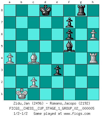Last move : 1/2-1/2 2022 October 9 23:8:18 [Event "FICGS__CHESS__CUP_STAGE_1_GROUP_02__000005"] [Site "FICGS"] [Date "2022.07.16"] [Round "1"] [White "Zidu,Jan"] [Black "Romano,Jacopo"] [Result "1/2-1/2"] [WhiteElo "2496"] [BlackElo "2192"] 1.e4 c5 2.Nf3 d6 3.d4 cxd4 4.Nxd4 Nf6 5.Nc3 Nc6 6.Bg5 e6 7.Qd2 a6 8.O-O-O Bd7 9.f4 b5 10.Bxf6 gxf6 11.Kb1 Qb6 12.Nxc6 Bxc6 13.f5 b4 14.Ne2 e5 15.Ng3 h5 16.h4 Bh6 17.Qxd6 Rd8 18.Qxd8+ Qxd8 19.Rxd8+ Kxd8 20.Bxa6 Rg8 21.Rh3 Bf4 22.Nxh5 Rxg2 23.Rh1 Bxe4 24.Bd3 Bc6 25.Nxf4 Rg4 26.Ng2 Rxg2 27.a3 bxa3 28.h5 Rg8 29.Rh4 e4 30.Bc4 Bd7 31.bxa3 Bxf5 32.a4 e3 33.h6 1/2-1/2 Sicilian : Richter-Rauzer, Rauzer attack, 7...a6 Queenside Castling by player White (move 8) This chess game ended in a draw. Follow this game move after move (download)One doesn't have to play well, it's enough to play better than your opponent. (Siegbert Tarrasch) Bis zum Jahr 1971 verlief in meiner Schachkariere alles glatt. Dieses dramatische Match [Fischer-Taimanov 6:0] machte mein Leben zur Hölle. (Mark Taimanov) El ganar no lo es todo... pero el perder es nada. (Mednis) Le thème de l'attaque double intervient d'une manière ou d'une autre dans l'immense majorité des combinaisons. (Youri Averbakh) Imagination is more important than knowledge. Knowledge is limited. Imagination encircles the world. (Albert Einstein)