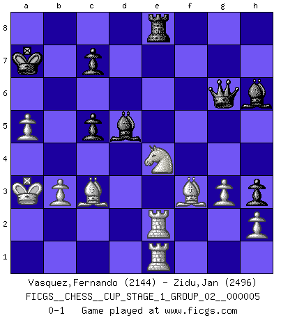 Last move : 0-1 2022 December 17 19:46:9 [Event "FICGS__CHESS__CUP_STAGE_1_GROUP_02__000005"] [Site "FICGS"] [Date "2022.07.16"] [Round "1"] [White "Vasquez,Fernando"] [Black "Zidu,Jan"] [Result "0-1"] [WhiteElo "2144"] [BlackElo "2496"] 1.e4 e5 2.Nf3 Nc6 3.d4 exd4 4.Nxd4 Nf6 5.Nxc6 bxc6 6.e5 Qe7 7.Qe2 Nd5 8.c4 Ba6 9.b3 g6 10.f4 g5 11.fxg5 O-O-O 12.Nd2 Qxg5 13.Nf3 Qg6 14.a3 Rg8 15.g3 Re8 16.Nh4 Qg7 17.Bb2 Qg5 18.Nf3 Qh6 19.Qf2 Nf6 20.Qxa7 Bb7 21.Bg2 Re6 22.Bc1 Qh5 23.Ra2 c5 24.Re2 Ne4 25.Nd2 Ra6 26.Qxa6 Bxa6 27.Nxe4 Be7 28.Bf4 Bb7 29.Kd2 Qg6 30.Kc1 h5 31.Kb1 h4 32.Ka2 h3 33.Bf3 Re8 34.Rhe1 f6 35.Bh1 fxe5 36.Bxe5 Bf8 37.Bb2 Re6 38.Bf3 Qf5 39.Bh1 Kb8 40.Bc3 Bh6 41.Rf2 Qg6 42.Rfe2 Qg4 43.a4 d5 44.cxd5 Bxd5 45.Ka3 Ka7 46.a5 Qg6 47.Bf3 Re8 0-1 Scotch : Mieses variation Queenside Castling by player Black (move 11) Player Black won this chess game. Follow this game move after move (download)It's just you and your opponent at the board and you're trying to prove something. (Bobby Fischer) Ich war schon mal beim Dopingtest. Da musste ich Urin abgeben, während Dritte zusahen. (Elisabeth Pähtz) Con o sin el título, Bobby Fischer fue sin lugar a dudas el mas grande jugador de su época. (Burt Hochberg) La solitude du joueur d'Echecs à l'approche du mat est semblable à celle du condamné. (Francis Szpiner) Whoever said the pen is mightier than the sword obviously never encountered automatic weapons. (US General Douglas MacArthur)