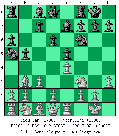 Last move : 0-1 2022 October 9 9:30:43 [Event "FICGS__CHESS__CUP_STAGE_1_GROUP_02__000005"] [Site "FICGS"] [Date "2022.07.16"] [Round "1"] [White "Zidu,Jan"] [Black "Mach,Jiri"] [Result "0-1"] [WhiteElo "2496"] [BlackElo "1936"] 1.e4 e5 2.Nf3 Nc6 3.Bb5 a6 4.Ba4 Nf6 5.O-O Be7 6.Re1 b5 7.Bb3 d6 8.c3 O-O 9.h3 Na5 0-1 This chess game has been lost on time (started : 2022.07.16 1:7:57) Ruy Lopez : Closed Kingside Castling by player White (move 5) Kingside Castling by player Black (move 8) Player Black won this chess game. Follow this game move after move (download)Chess is a terrible game. If you have no center, your opponent has a freer position. If you do have a center, then you really have something to worry about ! (Siegbert Tarrasch) Wie ich sie so einen nach dem anderen nieder mähte wurde meine Überlegenheit offensichtlich. (José Raúl Capablanca) Cuando tu no sabes absolutamente que mas hacer, es tiempo de entrar en pánico. (John van der Wiel) D'abord les bases : Jouez et étudiez, puis étudiez et jouez, ensuite jouez et étudiez, puis étudiez et jouez. Deuxièmement : Donnez toujours le meilleur de vous-même ! (Ken Smith) Don't be irreplaceable, if you can't be replaced, you can't be promoted. (Dan Rotaru)