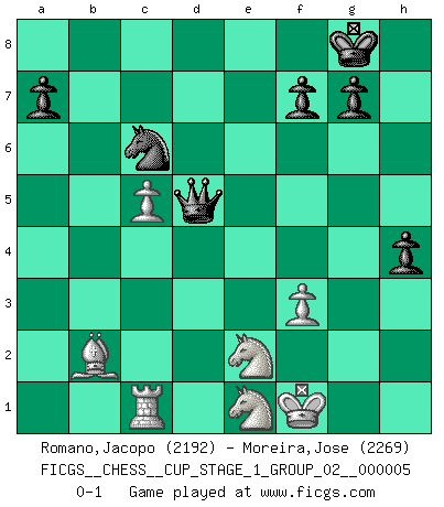 Last move : 0-1 2022 August 9 17:19:52 [Event "FICGS__CHESS__CUP_STAGE_1_GROUP_02__000005"] [Site "FICGS"] [Date "2022.07.16"] [Round "1"] [White "Romano,Jacopo"] [Black "Moreira,Jose"] [Result "0-1"] [WhiteElo "2192"] [BlackElo "2269"] 1.e4 e5 2.Nf3 Nc6 3.Bc4 Nf6 4.Ng5 d5 5.exd5 Na5 6.Bb5+ c6 7.dxc6 bxc6 8.Bd3 Nd5 9.Nf3 Bd6 10.O-O Nf4 11.Re1 Nxd3 12.cxd3 O-O 13.Nc3 c5 14.Nxe5 Re8 15.Nc4 Bxh2+ 16.Kxh2 Qh4+ 17.Kg1 Bg4 18.Rxe8+ Rxe8 19.Qf1 Re6 20.Ne3 Rh6 21.f3 Qh2+ 22.Kf2 Bxf3 23.Qg1 Qf4 24.gxf3 Rh2+ 25.Ng2 Nc6 26.Ne2 Qh4+ 27.Kf1 Qh3 28.b4 Rh1 29.Qxh1 Qxh1+ 30.Kf2 Nxb4 31.Ne1 Qh4+ 32.Kf1 Qh3+ 33.Kf2 Qh2+ 34.Kf1 h5 35.Bb2 Qh1+ 36.Kf2 Qh4+ 37.Kf1 Qh1+ 38.Kf2 Qh4+ 39.Kf1 Qg5 40.Rc1 Qxd2 41.Bc3 Qxa2 42.d4 Qd5 43.Bd2 Qa2 44.Bc3 Nc6 45.dxc5 Qd5 46.Bb2 h4 0-1 Two knights defense Kingside Castling by player White (move 10) Kingside Castling by player Black (move 12) Player Black won this chess game. Follow this game move after move (download)You must take your opponent into a deep dark forest where 2+2=5, and the path leading out is only wide enough for one. (Mikhail Tal) Schach ist das schnellste Spiel der Welt, weil man in jeder Sekunde Tausende von Gedanken ordnen muß. (Albert Einstein) El Ajedrez, como cualquier otra actividad creativa, puede existir solo a través de méritos combinados de aquellos que tienen talento creativo y de aquellos que tienen la habilidad de organizar un trabajo creativo. (Mikhail Botvinnik) Le pion, dans sa simplicité, marche droit devant lui, mais lorsqu'il prend, il le fait obliquement? Ainsi l'homme, tant qu'il reste pauvre, marche dans la droiture et vit honnêtement, mais lorsqu'il recherche les honneurs, il flatte, se parjure et, par les voies obliques, cherche une position supérieure sur l'échiquier du monde. (Jean de Galles) You know what they say : You lie down with the Devil, you wake up in Hell. (Horatio Caine, C.S.I. Miami)