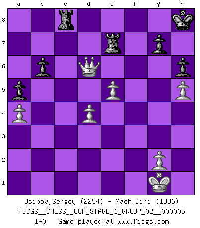 Last move : 1-0 2022 September 29 14:17:3 [Event "FICGS__CHESS__CUP_STAGE_1_GROUP_02__000005"] [Site "FICGS"] [Date "2022.07.16"] [Round "1"] [White "Osipov,Sergey"] [Black "Mach,Jiri"] [Result "1-0"] [WhiteElo "2254"] [BlackElo "1936"] 1.d4 Nf6 2.c4 e6 3.Nc3 Bb4 4.f3 d5 5.a3 Bxc3+ 6.bxc3 c5 7.cxd5 exd5 8.e3 Qc7 9.Bd3 cxd4 10.cxd4 Qc3+ 11.Qd2 Qxa1 12.Ne2 Nc6 13.O-O Ne5 14.Bb2 Qxf1+ 15.Kxf1 Nxd3 16.Qxd3 O-O 17.e4 Be6 18.Kg1 Rfc8 19.e5 Nd7 20.h4 Rc6 21.h5 h6 22.f4 Bg4 23.Nc3 Nb6 24.a4 a5 25.Ba3 Rac8 26.Bc5 Rd8 27.f5 Nc8 28.Ne2 Bxe2 29.Qxe2 b6 30.Ba3 Kh7 31.Qf3 Kg8 32.Qg4 Kh8 33.Qg3 Kh7 34.Qf3 Kg8 35.f6 Kh8 36.Be7 Nxe7 37.fxe7 Re8 38.Qxf7 R6c8 39.Qxd5 Rxe7 40.Qd6 1-0 Nimzo-Indian : Kmoch variation Kingside Castling by player White (move 13) Kingside Castling by player Black (move 16) Player White won this chess game. Follow this game move after move (download)A player surprised is half beaten. (Proverb) Obwohl ich vom Stil her kaum zu den Priestern der Schachkunst gezählt werde, halte ich Schach doch für eine Kunst. (Tigran Petrosjan) Una buena ofensiva y una buena defensa, comienzan ambas con un buen desarrollo. (Bruce A. Moon) A chaque perte on perd un peu de soi. (Joël Lautier) If only faces could talk... (Pat Summerall, Sportscaster during the Super Bowl)