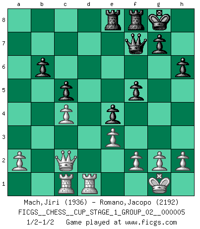 Last move : 1/2-1/2 2022 September 18 17:45:32 [Event "FICGS__CHESS__CUP_STAGE_1_GROUP_02__000005"] [Site "FICGS"] [Date "2022.07.16"] [Round "1"] [White "Mach,Jiri"] [Black "Romano,Jacopo"] [Result "1/2-1/2"] [WhiteElo "1936"] [BlackElo "2192"] 1.d4 d5 2.c4 e6 3.Nc3 Nf6 4.Bg5 Be7 5.Nf3 h6 6.Bh4 O-O 7.e3 b6 8.Bd3 Bb7 9.O-O Nbd7 10.Qe2 c5 11.Rfd1 Ne4 12.Bxe7 Qxe7 13.cxd5 exd5 14.Rac1 Rac8 15.dxc5 bxc5 16.Bxe4 dxe4 17.Nd2 f5 18.Nc4 Ba6 19.Nd5 Qf7 20.b3 Nb6 21.Ndxb6 axb6 22.Qc2 Bxc4 23.bxc4 Rce8 1/2-1/2 QGD : 4.Bg5 Be7 Kingside Castling by player Black (move 6) Kingside Castling by player White (move 9) This chess game ended in a draw. Follow this game move after move (download)You know you're going to lose. Even when I was ahead I knew I was going to lose. - On playing against Fischer. (Andrew Soltis) Privat ist Kortschnoi kein schlechter Mensch, sehr sympathisch. Aber während des Spiels ist er grausam. Er will dich töten. (Miguel Najdorf) Una victoria por una combinación errónea, aunque sea espectacular, me llena de horror artístico. (Wilhelm Steinitz) Les échecs sont un jeu terrible. Si vous n'avez pas le centre, votre adversaire a une position plus libre. Par contre, si vous avez le centre, alors vous avez vraiment quelque chose pour laquelle vous inquiéter ! (Siegbert Tarrasch) Yoga is 99% practice and 1% knowledge. (Sri Krishna Pattabhi Jois)