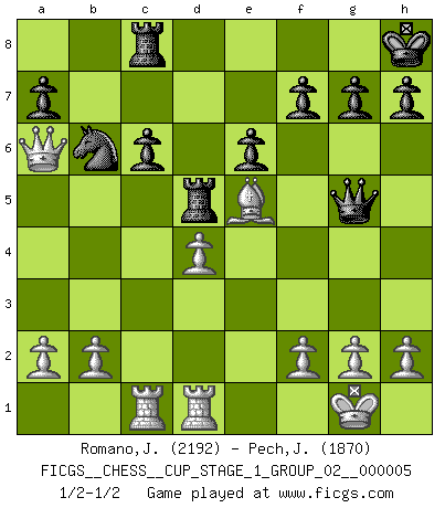 Last move : 1/2-1/2 2022 September 18 17:50:51 [Event "FICGS__CHESS__CUP_STAGE_1_GROUP_02__000005"] [Site "FICGS"] [Date "2022.07.16"] [Round "1"] [White "Romano,Jacopo"] [Black "Pech,Jaroslav senior"] [Result "1/2-1/2"] [WhiteElo "2192"] [BlackElo "1870"] 1.e4 c5 2.c3 Nf6 3.e5 Nd5 4.d4 cxd4 5.Nf3 d6 6.cxd4 Nc6 7.Bc4 Nb6 8.Bb5 dxe5 9.Nxe5 Bd7 10.Nxd7 Qxd7 11.Nc3 e6 12.O-O Be7 13.Qg4 O-O 14.Bxc6 bxc6 15.Bh6 Bf6 16.Rfd1 Kh8 17.Ne4 Qe7 18.Bf4 Rfd8 19.Nxf6 Qxf6 20.Bg3 Rd5 21.Rac1 Rc8 22.Be5 Qg6 23.Qe2 Qg5 24.Qa6 1/2-1/2 Sicilian : Alapin's variation (2.c3) Kingside Castling by player White (move 12) Kingside Castling by player Black (move 13) This chess game ended in a draw. Follow this game move after move (download)Chess is a terrific way for kids to build self image and self esteem. (Saudin Robovic) Das Blackmar-Diemer-Gambit verändert den ganzen Menschen! (Emil Joseph Diemer) Solo los afeminados hacen el Enroque. (Rob Sillars) C'est une question de caractère, Beaucoup de gens perdent leur motivation très vite. D'autres, ils sont rares, peuvent la conserver très longtemps. J'aime les échecs, encore aujourd'hui je suis heureux d'analyser des parties. J'aime toujours gagner, je déteste encore perdre. Bien jouer est important pour mon intégrité intellectuelle et morale. Et puis les échecs vivent en ce moment une période historique grâce à Internet. Ils se développent dans les systèmes éducatifs à travers le monde. Ils sortent de leur ghetto, et c'est mon rôle de mener à bien cette révolution. (Gary Kasparov) It is the aim of the modern school, not to treat every position according to one general law, but according to the principle inherent in the position. (Richard Reti)