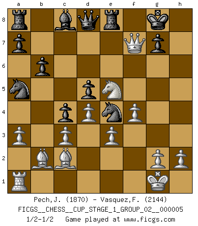 Last move : 1/2-1/2 2022 September 14 0:11:7 [Event "FICGS__CHESS__CUP_STAGE_1_GROUP_02__000005"] [Site "FICGS"] [Date "2022.07.16"] [Round "1"] [White "Pech,Jaroslav senior"] [Black "Vasquez,Fernando"] [Result "1/2-1/2"] [WhiteElo "1870"] [BlackElo "2144"] 1.d4 Nf6 2.c4 e6 3.Nc3 Bb4 4.e3 O-O 5.Bd3 d5 6.Nf3 c5 7.O-O Nc6 8.a3 Bxc3 9.bxc3 b6 10.cxd5 exd5 11.Ne5 Bb7 12.Bb2 c4 13.Bc2 Re8 14.f4 Na5 15.Rf3 Ne4 16.Rh3 Bc8 17.Rxh7 Kxh7 18.Qh5+ Kg8 19.Qxf7+ Kh7 20.Qh5+ Kg8 21.Qf7+ Kh7 22.Qh5+ Kg8 23.Qf7+ 1/2-1/2 Nimzo-Indian : 4.e3 O-O, 5.Bd3 d5 Kingside Castling by player Black (move 4) Kingside Castling by player White (move 7) This chess game ended in a draw. Follow this game move after move (download)A Chess game is divided into three stages: the first, when you hope you have the advantage, the second when you believe you have an advantage, and the third... when you know you're going to lose ! (Savielly Tartakower) Mit Schach schule ich mein Gefühl für Geometrie, was für Tennis und Schach gleichermaßen wichtig ist. (Boris Becker) Nos gusta pensar. (Gary Kasparov) L'attaque fait le spectacle, la défense gagne les matchs. (Dicton footballistique) Hold em is to stud what chess is to checkers. (Johnny Moss)