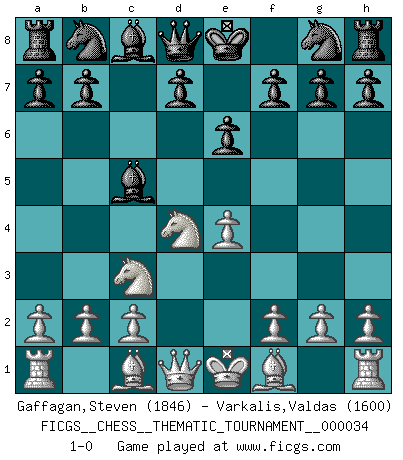 Last move : 1-0 2007 September 11 19:54:53 [Event "FICGS__CHESS__THEMATIC_TOURNAMENT__000034"] [Site "FICGS"] [Date "2007.08.02"] [Round "1"] [White "Gaffagan,Steven"] [Black "Varkalis,Valdas"] [Result "1-0"] [WhiteElo "1846"] [BlackElo "1600"] 1.e4 c5 2.Nf3 e6 3.d4 cxd4 4.Nxd4 Bc5 5.Nc3 1-0 This chess game has been lost on time (started : 2007.08.02 17:51:17) Sicilian defense Player White won this chess game. Follow this game move after move (download)Could we look into the head of a Chess player, we should see there a whole world of feelings, images, ideas, emotion and passion. (Alfred Binet) Matt entspricht nicht immer den Tatsachen. (Savielly Grigorievitsch Tartakower) Las piezas de Ajedrez son los bloques del alfabeto que moldean los pensamientos; y esos pensamientos, aunque hagan un diseño visual en el tablero, expresan abstractamente su belleza como un poema. (Marcel Duchamp) Même si l'adversaire joue le coup analysé précédemment, recommencez l'analyse en voyant la nouvelle position. Première règle de Blumenfeld Somewhere in the world there is an epigram for every dilemma. (Hendrik Willem van Loon)