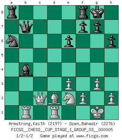 Last move : 1/2-1/2 2022 August 29 6:23:25 [Event "FICGS__CHESS__CUP_STAGE_1_GROUP_03__000005"] [Site "FICGS"] [Date "2022.07.16"] [Round "1"] [White "Armstrong,Keith"] [Black "Ozen,Bahadir"] [Result "1/2-1/2"] [WhiteElo "2197"] [BlackElo "2276"] 1.d4 Nf6 2.Nf3 e6 3.c4 d5 4.Nc3 c6 5.e3 Nbd7 6.Qc2 Bd6 7.Bd3 O-O 8.O-O dxc4 9.Bxc4 a6 10.Rd1 b5 11.Bd3 Bb7 12.Ng5 h6 13.Nge4 Bb8 14.b4 a5 15.bxa5 Qxa5 16.Bd2 Qc7 17.g3 c5 18.dxc5 Nxe4 19.Bxe4 Nxc5 20.Bxb7 Qxb7 21.Rab1 b4 22.Ne2 Na6 23.a3 Bd6 24.axb4 Bxb4 1/2-1/2 Queen's pawn game Kingside Castling by player Black (move 7) Kingside Castling by player White (move 8) This chess game ended in a draw. Follow this game move after move (download)There are two classes of men; those who are content to yield to circumstances and who play whist; those who aim to control circumstances, and who play Chess. (Mortimer Collins) Je älter ich werde, um so mehr schätze ich die Bauern. (Paul Keres) Nunca nadie ha ganado una partida de Ajedrez rindiendose. (Unknown) Ce qui caractérise les parties de combat, c'est que si le défenseur a constamment de difficiles problèmes à résoudre, l'attaquant doit chercher sans relâche de nouvelles possibilités d'attaque. (Koblentz) The large trees attract high winds. (Chinese proverb)