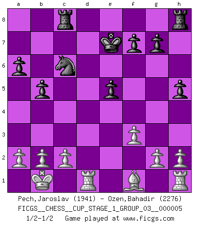 Last move : 1/2-1/2 2022 September 24 17:47:23 [Event "FICGS__CHESS__CUP_STAGE_1_GROUP_03__000005"] [Site "FICGS"] [Date "2022.07.16"] [Round "1"] [White "Pech,Jaroslav"] [Black "Ozen,Bahadir"] [Result "1/2-1/2"] [WhiteElo "1941"] [BlackElo "2276"] 1.e4 c5 2.Nf3 d6 3.d4 cxd4 4.Nxd4 Nf6 5.Nc3 a6 6.Be3 e5 7.Nb3 Be6 8.f3 h5 9.Qd2 Nbd7 10.O-O-O Be7 11.Kb1 b5 12.Nd5 Bxd5 13.exd5 Nb6 14.Bxb6 Qxb6 15.Na5 Rc8 16.Nc6 Nxd5 17.Nxe7 Nxe7 18.Qxd6 Qxd6 19.Rxd6 Nc6 20.Rd1 Ke7 1/2-1/2 Sicilian : Najdorf, Byrne (English) attack Queenside Castling by player White (move 10) This chess game ended in a draw. Follow this game move after move (download)When you play Bobby, it is not a question if you win or lose. It is a question if you survive. (Boris Spassky) Der Freibauer hat für mich eine Seele, genau wie der Mensch, Wünsche, die unerkannt in ihm schlummern, und Befürchtungen, von deren Existenz er selbst kaum ahnt. (Aaron Nimzowitsch) Cuando estes solo, cuando te sientas un extraño en el mundo, juega al Ajedrez. Esto levantará tu espiritu y será tu consejero de guerra. (Aristóteles) Mais l'homme est une créature légère et illogique : semblable au joueur d'échecs, il n'aime que le processus du but à atteindre, non le but lui-même. (Dostoïevsky) Never risk one's whole fortune unless supported by one's entire army. (Niccolo Machiavelli)