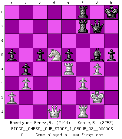 Last move : 0-1 2022 November 21 6:51:41 [Event "FICGS__CHESS__CUP_STAGE_1_GROUP_03__000005"] [Site "FICGS"] [Date "2022.07.16"] [Round "1"] [White "Rodriguez Perez,Rene"] [Black "Kosic,Branko"] [Result "0-1"] [WhiteElo "2144"] [BlackElo "2252"] 1.e4 c5 2.Nf3 Nc6 3.d4 cxd4 4.Nxd4 Nf6 5.Nc3 e5 6.Ndb5 d6 7.Bg5 a6 8.Na3 b5 9.Nd5 Be7 10.Bxf6 Bxf6 11.c4 b4 12.Nc2 a5 13.g3 O-O 14.b3 Bg5 15.Bg2 Ne7 16.h4 Bh6 17.Nxe7+ Qxe7 18.O-O g6 19.Qd3 Be6 20.Rad1 Rad8 21.Ne3 f5 22.Nd5 Qf7 23.Bh3 Bc8 24.Kh2 Kh8 25.Qe2 Qg7 26.h5 gxh5 27.Qxh5 fxe4 28.Bxc8 Rxc8 29.Rde1 Rf3 30.Rxe4 Rcf8 31.Kg2 R3f5 32.Qd1 Bg5 33.f3 h5 34.g4 R5f7 35.c5 dxc5 0-1 This chess game has been lost on time (started : 2022.07.16 1:7:59) Sicilian : Pelikan (Lasker/Sveshnikov) variation Kingside Castling by player Black (move 13) Kingside Castling by player White (move 18) Player Black won this chess game. Follow this game move after move (download)I look one move ahead... the best ! (Siegbert Tarrasch) Im Leben werden Partien nie so unstrittig gewonnen wie im Spiel (Emanuel Lasker) No existe un remordimiento como el remordimiento del Ajedrez. (H. G. Wells) La menace est plus forte que l'exécution. (Aaron Nimzovitch) Humor is by far the most significant activity of the human brain. (Edward De Bono)