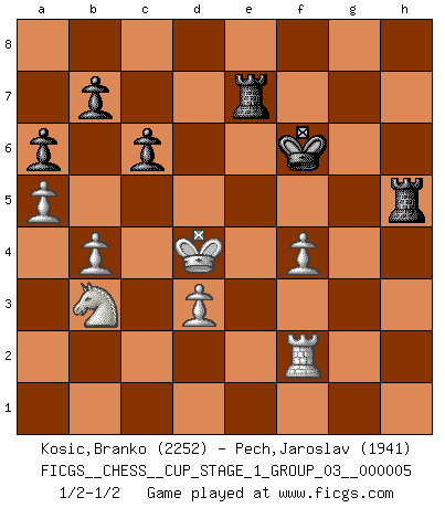 Last move : 1/2-1/2 2023 February 2 14:4:12 [Event "FICGS__CHESS__CUP_STAGE_1_GROUP_03__000005"] [Site "FICGS"] [Date "2022.07.16"] [Round "1"] [White "Kosic,Branko"] [Black "Pech,Jaroslav"] [Result "1/2-1/2"] [WhiteElo "2252"] [BlackElo "1941"] 1.c4 e5 2.g3 Nf6 3.Bg2 d5 4.cxd5 Nxd5 5.Nc3 Nb6 6.Nf3 Nc6 7.O-O Be7 8.d3 O-O 9.a3 Be6 10.Be3 f5 11.Rc1 Bf6 12.Nd2 Rb8 13.Nb3 Nd5 14.Nc5 Nxc3 15.Rxc3 Bd5 16.Rc1 Rf7 17.Bxd5 Qxd5 18.b4 Nd4 19.Bxd4 exd4 20.Qb3 Qxb3 21.Nxb3 c6 22.f4 Re8 23.Rc2 Rfe7 24.Kf2 a6 25.a4 Kf7 26.h4 h6 27.Rh1 g5 28.hxg5 hxg5 29.Rh6 g4 30.Rh7+ Bg7 31.Rh5 Bf6 32.Rxf5 Kg6 33.Rxf6+ Kxf6 34.Nxd4 Rh7 35.Rc5 Rh2+ 36.Kg1 Rh7 37.Rf5+ Kg6 38.Rg5+ Kf6 39.Rf5+ Kg6 40.Rg5+ Kf6 41.Kf1 Rh1+ 42.Kf2 Rh2+ 43.Ke1 Rg2 44.Kd2 Rxg3 45.e4 Rd8 46.Kc3 Kf7 47.e5 Rd5 48.a5 Ke8 49.Kc4 Kf7 50.e6+ Kf6 51.e7 Re3 52.Rxg4 Rxe7 53.Nb3 Rh5 54.Rg2 Rh4 55.Rf2 Kf5 56.Nd4+ Kg6 57.Kc5 Kf6 58.Nb3 Rh5+ 59.Kd4 1/2-1/2 English Opening Kingside Castling by player White (move 7) Kingside Castling by player Black (move 8) This chess game ended in a draw. Follow this game move after move (download)Before the endgame, the Gods have placed the middle game. (Siegbert Tarrasch) Alle offensichtlichen Züge sehen nach dem Spiel in der Analyse verdächtig aus. (Viktor Kortschnoi) Combinaciones deslumbrantes son para la mayoría, mover madera es para los pocos. (Georg Kieninger) Le joueur d'Echecs qui veut atteindre le top est obligé de développer son propre credo créatif. Alexeï Stepanovicth Souétine. Il est facile d'écrire des livres ! Ce qui est difficile, c'est de jouer ! (Alexeï Stepanovicth Souétine) I fear not the man who has practiced 10,000 kicks once, but I fear the man who has practiced one kick 10,000 times. (Bruce Lee)