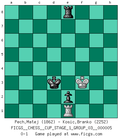 Last move : 0-1 2023 January 16 16:19:52 [Event "FICGS__CHESS__CUP_STAGE_1_GROUP_03__000005"] [Site "FICGS"] [Date "2022.07.16"] [Round "1"] [White "Pech,Matej"] [Black "Kosic,Branko"] [Result "0-1"] [WhiteElo "1862"] [BlackElo "2252"] 1.e4 c5 2.Nf3 Nc6 3.d4 cxd4 4.Nxd4 Nf6 5.Nc3 e5 6.Ndb5 d6 7.Bg5 a6 8.Na3 b5 9.Bxf6 gxf6 10.Nd5 f5 11.Bd3 Be6 12.c3 Bg7 13.Qh5 O-O 14.O-O f4 15.Rfd1 Rb8 16.Nc2 Kh8 17.Ncb4 Nxb4 18.Nxb4 Ra8 19.Be2 f5 20.exf5 Bxf5 21.Rd2 e4 22.Bg4 Bg6 23.Qh3 Be5 24.Rad1 Qg5 25.Nc6 Rae8 26.Nxe5 dxe5 27.Rd6 Re7 28.Be6 h5 29.Rd8 Rxd8 30.Rxd8+ Kh7 31.Rd1 f3 32.Bd5 Kh6 33.Qg3 Qf6 34.h4 Rg7 35.Qg5+ Qxg5 36.hxg5+ Kxg5 37.Kh2 fxg2 38.Rg1 Rd7 39.Rxg2+ Kf6 40.c4 bxc4 41.Bxc4 a5 42.a3 Rd2 43.b4 axb4 44.axb4 Rd4 45.Be6 Rxb4 46.Bc8 Rb2 47.Kg1 Rb1+ 48.Kh2 Bf5 49.Rg8 Bxc8 50.Rxc8 Re1 51.Rf8+ Kg5 52.Re8 Kf5 53.Kg2 e3 54.fxe3 Rxe3 55.Rh8 Kg6 56.Kf2 Re4 57.Kg2 Rf4 58.Re8 Kf5 59.Rh8 h4 60.Rf8+ Ke4 61.Ra8 Rf5 62.Ra4+ Ke3 63.Rxh4 e4 64.Rh1 Ke2 65.Kg3 Rf3+ 66.Kg2 Rf8 67.Kg3 Rg8+ 68.Kf4 e3 69.Rh2+ Kd3 70.Ra2 Re8 71.Ra3+ Kd4 72.Ra4+ Kc5 73.Ra1 e2 74.Re1 Kd4 75.Kf3 Kd3 0-1 Sicilian : Pelikan (Lasker/Sveshnikov) variation Kingside Castling by player Black (move 13) Kingside Castling by player White (move 14) 10 pieces endgame at move 45 : White KRBP , Black KRBPPP WHITE : King + 1 Rook 1 Bishop 1 Pawn BLACK : King + 1 Rook 1 Bishop 3 Pawns 9 pieces endgame at move 49 : White KRP , Black KRBPPP WHITE : King + 1 Rook 1 Pawn BLACK : King + 1 Rook 1 Bishop 3 Pawns 8 pieces endgame at move 50 : White KRP , Black KRPPP WHITE : King + 1 Rook 1 Pawn BLACK : King + 1 Rook 3 Pawns 7 pieces endgame at move 54 : White KRP , Black KRPP WHITE : King + 1 Rook 1 Pawn BLACK : King + 1 Rook 2 Pawns 6 pieces endgame at move 54 : White KR , Black KRPP WHITE : King + 1 Rook BLACK : King + 1 Rook 2 Pawns 5 pieces endgame at move 63 : White KR , Black KRP WHITE : King + 1 Rook BLACK : King + 1 Rook 1 Pawn Player Black won this chess game. Follow this game move after move (download)The tactician must know what to do whenever something needs doing; the strategist must know what to do when nothing needs doing. (Savielly Tartakover) Alles was am Schachbrett zählt sind gute Züge. (Robert James Fischer) La partida mas dura de ganar es una partida ganada. (Emanuel Lasker) Plusieurs personnes se sont demandées comment Tal faisait pour gagner... En fait, c'est très simple ! Il met ses pièces au centre de l'échiquier et les sacrifie quelque part ! (David Bronstein) The existence of forgetting has never been proved: We only know that some things don't come to mind when we want them. (Friedrich Nietzsche)