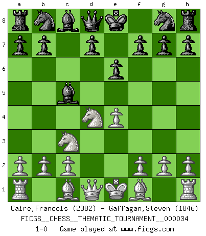 Last move : 1-0 2007 September 12 1:59:44 [Event "FICGS__CHESS__THEMATIC_TOURNAMENT__000034"] [Site "FICGS"] [Date "2007.08.02"] [Round "1"] [White "Caire,Francois"] [Black "Gaffagan,Steven"] [Result "1-0"] [WhiteElo "2382"] [BlackElo "1846"] 1.e4 c5 2.Nf3 e6 3.d4 cxd4 4.Nxd4 Bc5 5.Nc3 1-0 This chess game has been lost on time (started : 2007.08.02 17:51:17) Sicilian defense Player White won this chess game. Follow this game move after move (download)Chess is a more highly symbolic game, but the aggressions are therefore even more frankly represented in the play. It probably began as a war game; that is, the representation of a miniature battle between the forces of two kingdoms. (Karl Meninger) Den Ruhm habe ich schon, jetzt brauche ich noch das Geld. (Wilhelm Steinitz) El juego del Ajedrez no es solamente una diversión quieta; algunas cualidades muy valuables de la mente se pueden adquirir y cultivar con el, como convertirlos en habitos disponibles para toda ocasión; ya que la vida es algo así como el Ajedrez. (Benjamin Franklin) Je fais ceci parce que dans cinquante coups j'obtiendrai cela; je m'appelle Mikhail Moisevitch Botvinnik. (Botvinnik) When you've done things right people won't know you've done anything at all. (Futurama)