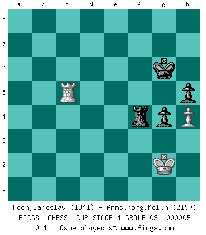 Last move : 0-1 2022 November 20 13:28:43 [Event "FICGS__CHESS__CUP_STAGE_1_GROUP_03__000005"] [Site "FICGS"] [Date "2022.07.16"] [Round "1"] [White "Pech,Jaroslav"] [Black "Armstrong,Keith"] [Result "0-1"] [WhiteElo "1941"] [BlackElo "2197"] 1.d4 Nf6 2.c4 e6 3.Nc3 Bb4 4.e3 O-O 5.Bd3 d5 6.Nf3 c5 7.O-O cxd4 8.exd4 dxc4 9.Bxc4 b6 10.Bg5 Bb7 11.Qe2 Bxc3 12.bxc3 Nbd7 13.Bd3 Qc7 14.Rac1 h6 15.Bd2 Rac8 16.Rfe1 Qd6 17.h3 Rfd8 18.Ba6 Bxa6 19.Qxa6 Nf8 20.a4 Ng6 21.c4 Rc7 22.a5 Qc6 23.axb6 axb6 24.Qa3 Rdc8 25.Be3 Qb7 26.Qd3 Qe4 27.Qf1 Nh4 28.Nxh4 Qxh4 29.Qd3 Rc6 30.Red1 Qe4 31.Qb3 Qf5 32.Kh2 Qh5 33.f3 Qf5 34.Rf1 Nd7 35.Rg1 Qa5 36.Rc2 Nf6 37.Bd2 Qa7 38.Rgc1 Qc7+ 39.g3 Qd7 40.Qb2 b5 41.c5 Qd5 42.Bf4 Qxf3 43.Qxb5 Qe4 44.Be5 Nd7 45.Qe2 Qd5 46.Re1 Rd8 47.Bd6 Ra8 48.Qg2 Nf6 49.Qxd5 Nxd5 50.Rb1 Ra4 51.Rb8+ Kh7 52.Rf2 Kg6 53.Rg8 f6 54.Re8 Kf7 55.Rf8+ Kg6 56.Re8 Rxd4 57.Rxe6 Nc7 58.R6e2 Na6 59.Rd2 Rxd2 60.Rxd2 Nxc5 61.Bxc5 Rxc5 62.Rb2 Kh5 63.Rb4 Rc2+ 64.Kg1 g5 65.Rb7 Kg6 66.Rb4 h5 67.Ra4 Re2 68.h4 g4 69.Kf1 Rd2 70.Ra5 f5 71.Ra6+ Kg7 72.Rc6 f4 73.gxf4 Rd4 74.Kg2 Rxf4 75.Rc5 Kg6 0-1 Nimzo-Indian : 4.e3 O-O, 5.Bd3 d5 Kingside Castling by player Black (move 4) Kingside Castling by player White (move 7) 10 pieces endgame at move 61 : White KRBPP , Black KRPPP WHITE : King + 1 Rook 1 Bishop 2 Pawns BLACK : King + 1 Rook 3 Pawns 9 pieces endgame at move 61 : White KRPP , Black KRPPP WHITE : King + 1 Rook 2 Pawns BLACK : King + 1 Rook 3 Pawns 8 pieces endgame at move 73 : White KRPP , Black KRPP WHITE : King + 1 Rook 2 Pawns BLACK : King + 1 Rook 2 Pawns 7 pieces endgame at move 74 : White KRP , Black KRPP WHITE : King + 1 Rook 1 Pawn BLACK : King + 1 Rook 2 Pawns Player Black won this chess game. Follow this game move after move (download)In a gambit you give up a Pawn for the sake of getting a lost game. (Samuel Standige Boden) Schach ist das Spiel, das die Verrückten gesund hält. (Albert Einstein) El Ajedrez es un juego de pelea el cual es puramente intelectual e incluye la suerte. (Richard Reti) Il n'y a pas eu de défaite parce que je ne crois pas que cet ordinateur ait jamais existé. IBM a triché en refusant d'imprimer les modes de recherche de la machine. C'est évident, pendant le match, des coups décisifs ont été joués par des êtres humains. Aujourd'hui, les meilleurs spécialistes en informatique ne peuvent toujours pas expliquer comment Deep-Blue a pu jouer contre la logique des ordinateurs. IBM a gagné une guerre de communication, mais ils sont incapables de prouver que l'ordinateur a gagné tout seul. (Garry Kasparov) The Movers & Shakers of this world are those who play chess in the mornings and go to the disco in the evenings. (Dinesh De Silva)