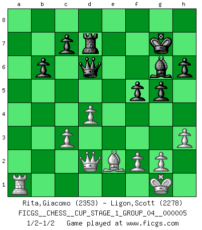 Last move : 1/2-1/2 2022 August 15 18:18:24 [Event "FICGS__CHESS__CUP_STAGE_1_GROUP_04__000005"] [Site "FICGS"] [Date "2022.07.16"] [Round "1"] [White "Rita,Giacomo"] [Black "Ligon,Scott"] [Result "1/2-1/2"] [WhiteElo "2353"] [BlackElo "2278"] 1.e4 e5 2.Nf3 Nf6 3.d4 Nxe4 4.Nxe5 d5 5.Bd3 Nd7 6.Nxd7 Bxd7 7.O-O Bd6 8.Nc3 Nxc3 9.bxc3 O-O 10.Qh5 f5 11.Re1 h6 12.a4 Qf6 13.Qf3 Kh8 14.Bf4 Rae8 15.Reb1 Bc8 16.a5 Bxf4 17.Qxf4 Re7 18.Re1 Rfe8 19.Rxe7 Rxe7 20.Qf3 Qd6 21.Bf1 Bd7 22.Qd3 Kh7 23.h3 b5 24.axb6 axb6 25.Qd1 Be8 26.Qd2 g5 27.c4 dxc4 28.Bxc4 Kg6 29.Bd3 Kf6 30.Bf1 Rd7 31.c3 Bg6 32.Be2 Kg7 1/2-1/2 Petrov : Modern attack, Symmetrical variation Kingside Castling by player White (move 7) Kingside Castling by player Black (move 9) This chess game ended in a draw. Follow this game move after move (download)The tactician knows what to do when there is something to do; whereas the strategian knows what to do when there is nothing to do. (Gerald Abrahams) Im Reiche der Wirklichkeit ist man nie so glücklich wie im Reiche der Gedanken. (Arthur Schopenhauer) Ayuda a tus piezas para que ellas te puedan ayudar. (Paul Morphy) Celui qui prend des risques peut perdre, celui qui n'en prend pas perd toujours. (Xavier Tartacover) Programmer - an organism that turns coffee into software. (Anonymous)