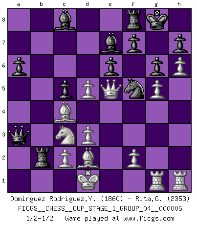 Last move : 1/2-1/2 2022 September 11 17:30:26 [Event "FICGS__CHESS__CUP_STAGE_1_GROUP_04__000005"] [Site "FICGS"] [Date "2022.07.16"] [Round "1"] [White "Dominguez Rodriguez,Yosvany"] [Black "Rita,Giacomo"] [Result "1/2-1/2"] [WhiteElo "1860"] [BlackElo "2353"] 1.e4 c5 2.Nc3 Nc6 3.Bb5 Nd4 4.Bc4 a6 5.a4 e6 6.d3 Nf6 7.Nf3 Qc7 8.Ba2 Be7 9.h3 Nxf3+ 10.Qxf3 b6 11.g4 O-O 12.Bf4 d6 13.g5 Ne8 14.h4 Rb8 15.h5 b5 16.O-O-O bxa4 17.Rdg1 a3 18.bxa3 Qa5 19.Bd2 Qxa3+ 20.Kd1 d5 21.h6 g6 22.exd5 Rb2 23.Bc4 Nd6 24.Qf4 Nf5 25.Qe5 Bd6 26.Qf6 Be7 27.Qe5 Bd6 28.Qf6 Be7 29.Qe5 1/2-1/2 Sicilian : Closed, 2...Nc6 Kingside Castling by player Black (move 11) Queenside Castling by player White (move 16) This chess game ended in a draw. Follow this game move after move (download)On the chessboard, lies and hypocrisy do not survive long. (Emanuel Lasker) Das Blackmar-Diemer-Gambit verändert den ganzen Menschen! (Emil Joseph Diemer) Observen a Garry Kasparov. Después de una derrota, invariablemente el gana la próxima partida. Prácticamente hace pedazos a su siguiente oponente. Eso es algo que tenemos que aprender a lograr. (Maurice Ashley) Toute estimation doit être constamment réévaluée. (Jacob Estrin) The man who strikes first admits that his ideas have given out. (Chinese proverb)