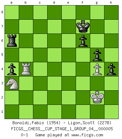 Last move : 0-1 2022 October 4 21:55:9 [Event "FICGS__CHESS__CUP_STAGE_1_GROUP_04__000005"] [Site "FICGS"] [Date "2022.07.16"] [Round "1"] [White "Bonoldi,Fabio"] [Black "Ligon,Scott"] [Result "0-1"] [WhiteElo "1954"] [BlackElo "2278"] 1.Nf3 Nf6 2.g3 c5 3.Bg2 Nc6 4.O-O e5 5.c4 d5 6.d3 Be7 7.cxd5 Nxd5 8.Nc3 Be6 9.Bd2 O-O 10.Nxd5 Bxd5 11.Bc3 Qd6 12.a3 Qe6 13.Qd2 a5 14.Qe3 f6 15.a4 b6 16.Nd2 Bxg2 17.Kxg2 Nd4 18.Rad1 Rab8 19.Nc4 Qd7 20.Qe4 Qxa4 21.Bxd4 cxd4 22.f4 Qd7 23.fxe5 Rfe8 24.e6 Qb7 25.Qxb7 Rxb7 26.Rf4 Bc5 27.e3 Rxe6 28.exd4 Bf8 29.Re4 Rc6 30.d5 Rc5 31.Re6 Rxd5 32.Rxb6 Rc7 33.b3 Bb4 34.Rb8+ Kf7 35.d4 Re7 36.Kf2 Rf5+ 37.Kg1 Kg6 38.Rc8 Re2 39.d5 R5f2 40.Ne3 Bd6 41.Rc6 Bb8 42.Ra6 Rxh2 43.d6 Rd2 44.Rxd2 Rxd2 45.Nc4 Rd3 46.Kg2 Rxb3 47.Rc6 Rd3 48.Rb6 Ba7 49.Rc6 a4 50.d7 Bb8 51.Rc8 Rxd7 52.Rxb8 Rc7 53.Rb4 Ra7 54.Na3 h5 55.Kf3 Kf7 56.g4 h4 57.Kg2 g6 58.Kh3 g5 59.Kg2 Ra6 0-1 Reti Opening Kingside Castling by player White (move 4) Kingside Castling by player Black (move 9) 10 pieces endgame at move 52 : White KRNP , Black KRPPPP WHITE : King + 1 Rook 1 Knight 1 Pawn BLACK : King + 1 Rook 4 Pawns Player Black won this chess game. Follow this game move after move (download)I still hope to kill Fischer. (Boris Spassky) Immer nach dem besten Zug zu suchen ist ziemlich unpraktisch. (Nigel Short) La mitad de las variaciones que son calculadas en una partida de torneo, resultan ser completamente superfluas. Desafortunadamente, nadie sabe por adelantado cual mitad. (Jan Tinman) Karpov est une pièce de musée. (Garry Kasparov) Is not life a hundred times too short to bore ourselves ? (Friedrich Nietzsche)