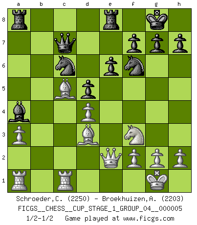 Last move : 1/2-1/2 2022 July 24 16:9:21 [Event "FICGS__CHESS__CUP_STAGE_1_GROUP_04__000005"] [Site "FICGS"] [Date "2022.07.16"] [Round "1"] [White "Schroeder,Christoph"] [Black "Broekhuizen,A. T. S."] [Result "1/2-1/2"] [WhiteElo "2250"] [BlackElo "2203"] 1.d4 Nf6 2.c4 e6 3.Nc3 Bb4 4.e3 O-O 5.Bd2 b6 6.Nf3 Bb7 7.Bd3 c5 8.a3 Bxc3 9.Bxc3 cxd4 10.exd4 d5 11.b3 a5 12.O-O a4 13.Bb4 Re8 14.bxa4 Bc6 15.c5 Bxa4 16.Qe2 Nc6 17.cxb6 Qxb6 18.Bc5 Qc7 19.Rfc1 1/2-1/2 Nimzo-Indian : 4.e3 O-O Kingside Castling by player Black (move 4) Kingside Castling by player White (move 12) This chess game ended in a draw. Follow this game move after move (download)Chess teaches you to control the initial excitement you feel when you see something that looks good and it trains you to think objectively when you're in trouble. (Stanley Kubrick) Ich habe die Schachforschung dermaßen betrieben, dass sie auf eine wissenschaftliche Basis gestellt wurde. (Mikhail Moiseyevich Botvinik) El hombre es un frívolo, una creatura engañosa y como un jugador de Ajedrez, se preocupa mas por el proceso de obtener su meta que de la meta por sí misma. (Dostoyevsky) J'ai vu le vaincu d'Echecs jouer des années durant dans l'espoir de la fête de la victoire. Car tu es plus riche de ce qu'elle existe si même elle n'est point pour toi. Ainsi de la perle du fond des mers. (Antoine de Saint-Exupéry) The absolute truth is the thing that makes people laugh. (Carl Reiner)