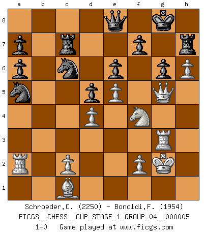 Last move : 1-0 2022 September 19 18:39:51 [Event "FICGS__CHESS__CUP_STAGE_1_GROUP_04__000005"] [Site "FICGS"] [Date "2022.07.16"] [Round "1"] [White "Schroeder,Christoph"] [Black "Bonoldi,Fabio"] [Result "1-0"] [WhiteElo "2250"] [BlackElo "1954"] 1.e4 e6 2.d4 d5 3.Nc3 Bb4 4.e5 c5 5.a3 Bxc3+ 6.bxc3 Ne7 7.Qg4 Kf8 8.h4 Qa5 9.Bd2 Qa4 10.h5 h6 11.Rh3 Nd7 12.Qf4 Nb6 13.Rf3 Qe8 14.Be3 cxd4 15.cxd4 Bd7 16.Bd3 Rc8 17.Ne2 Ba4 18.Ra2 Rc7 19.Kf1 Kg8 20.Bd2 Nc4 21.Bc1 Nf5 22.g4 Ne7 23.Kg2 Bb5 24.a4 Ba6 25.a5 Nc6 26.Rg3 N4xa5 27.Bxa6 bxa6 28.g5 hxg5 29.Qxg5 Rh7 30.h6 g6 31.Nf4 1-0 French : Winawer, Advance, poisoned pawn variation Player White won this chess game. Follow this game move after move (download)The passion for playing Chess is one of the most unaccountable in the world. (H.G. Wells) Vielleicht wirkt die Aura früherer Spieler glanzvoller als die der heutigen Spieler, aber das liegt daran, dass man kein Programm wie Fritz hatte, das einem all die Löcher in ihren Partien zeigt. (Vladimir Kramnik) El muchacho (en ese entonces un niño de 12 años llamado Anatoly Karpov) no tiene ni idea de lo que es el Ajedrez y no hay futuro en absoluto para el en esta profesión. (Mikhail Botvinnik) Les erreurs sont comme les malheurs, elles n'arrivent jamais seules. (Siegbert Tarrasch) If computers get too powerful, we can organize them into committees. That'll do them in. (Anonymous)
